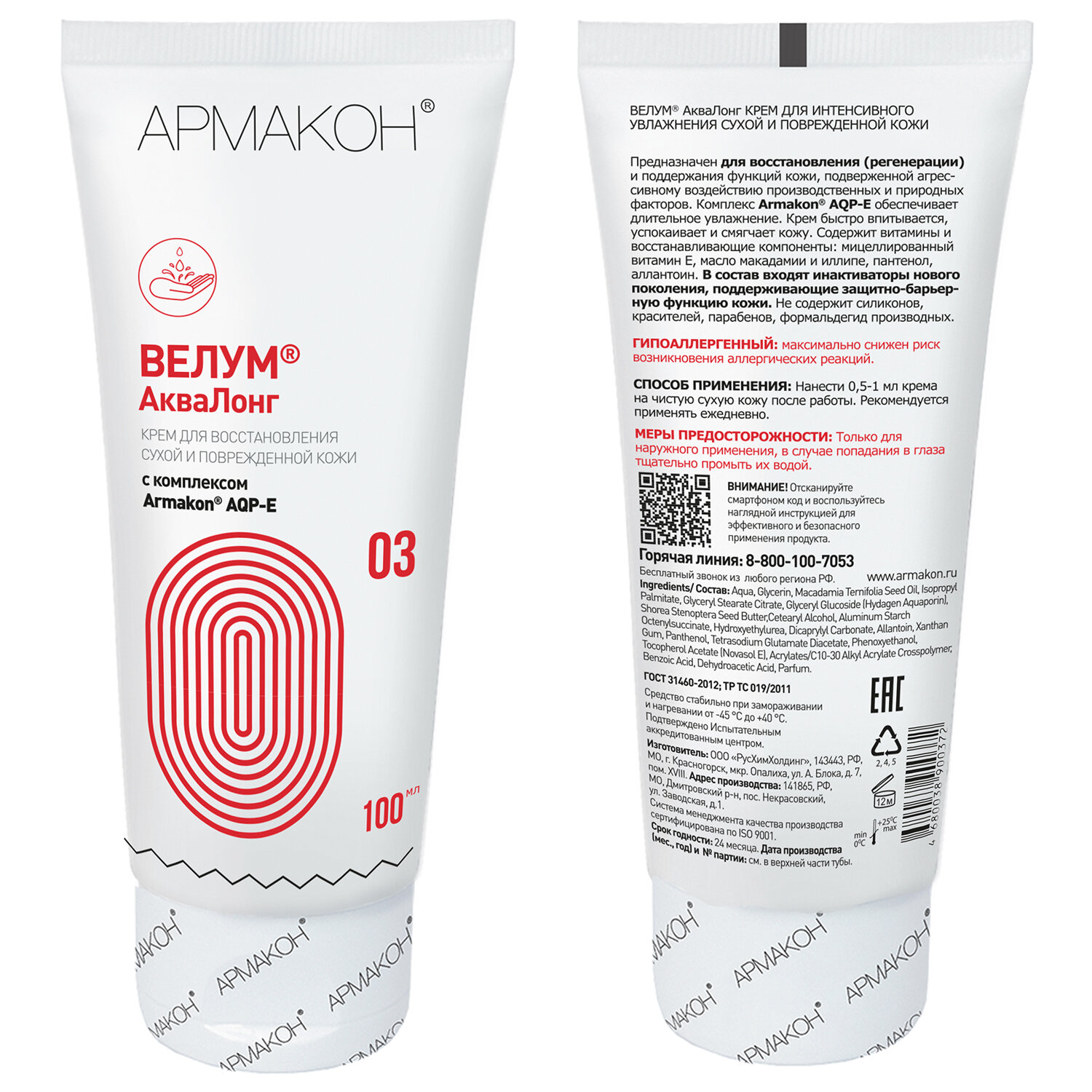 Крем регенерирующий с увлажнением 100 мл, АРМАКОН ВЕЛУМ АКВАЛОНГ, для сухой и поврежденной кожи Код товара: 701555 134,73 ₽ Купить Производитель:АРМАКОН Крем АРМАКОН ВЕЛУМ АКВАЛОНГ предназначен для восстановления (регенерации) и поддержания функций кожи, подверженной агрессивному воздействию производственных и природных факторов. Обладает регенерирующими свойствами, восстанавливает и поддерживает защитно-барьерную функцию кожи, интенсивно увлажняет. В СОСТАВ ВХОДЯТ ИНАКТИВАТОРЫ НОВОГО ПОКОЛЕНИЯ, нейтрализующие вредное воздействие солей тяжелых металлов и химических раздражителей, и поддерживающие защитно-барьерную функцию кожи. Эффективность подтверждена заключениями научных исследований. Комплекс Armakon® AQP-E обеспечивает глубокое и длительное увлажнение за счет увеличения количества ионных каналов кожи, через которые в клетки проникают молекулы воды и увлажняющие компоненты.Производство: РоссияФорма выпуска: кремОбъем: 100 млТип ДСИЗ: восстановлениеНазначение: для рукВид средства: регенерирующееВид абразива: нетЭффект от использования: восстановление, уходСерия: ВЕЛУМ АКВАЛОНГСоответствует требованиям стандарта: ТР ТС 019/2011Тип крышки: флип-топУпаковка: тубаСрок годности: 24 месВес: 122 грРазмер упаковки: 3.9 × 14.1 × 6 смОбъём: 0.0004 м3Промежуточная упаковка: 50 штТранспортная упаковка: 50 штШтрих-код: 4680038900372 Сертификат-1.jpg Сертификат-2.jpg Сертификат-3.jpg