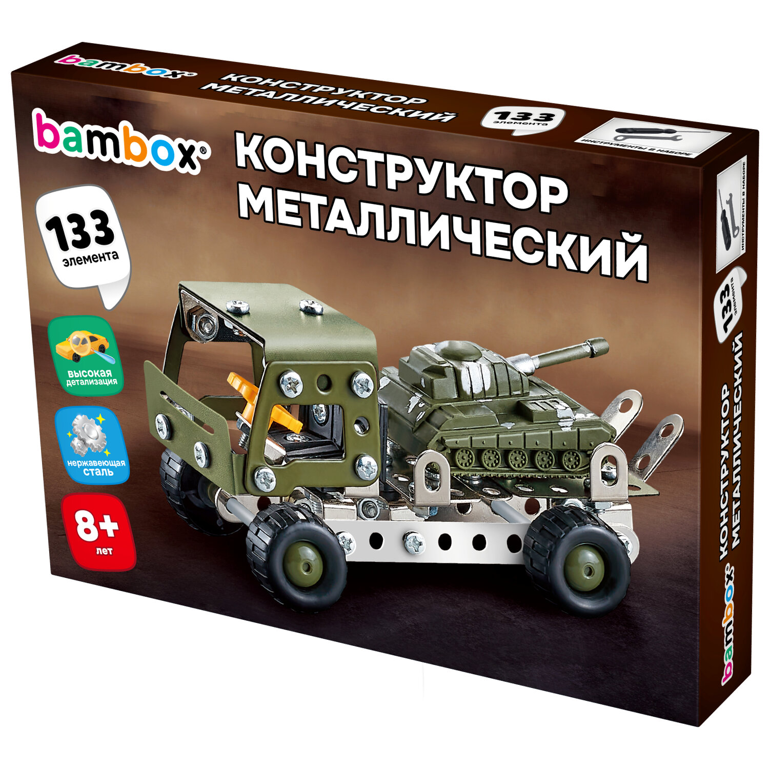 Металлический конструктор BAMBOX "Грузовик с танком" – развивающая игрушка для детей старше 8 лет. Конструктор идеально подходит для занятий на уроках труда и комплексного развития ребёнка.