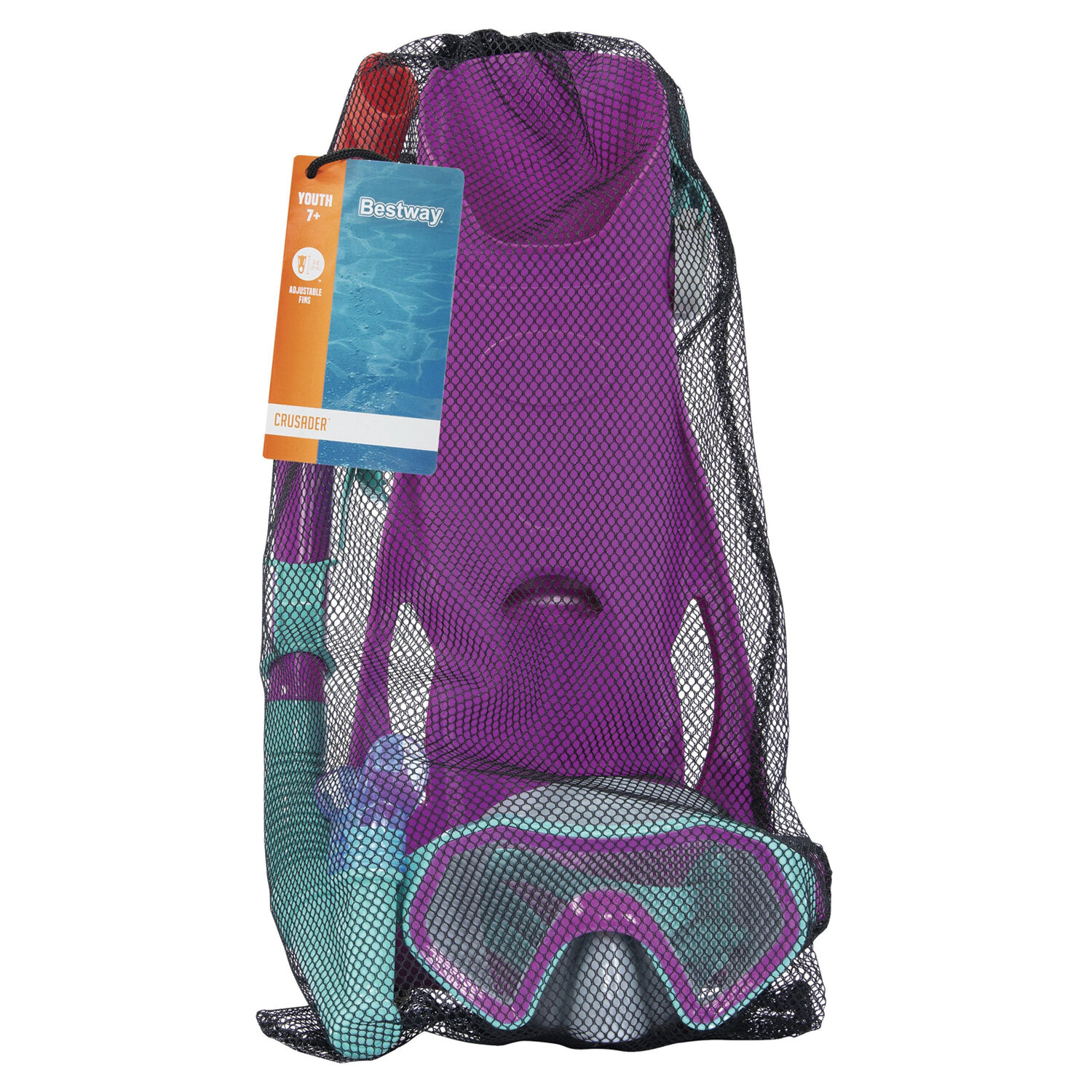 Комплект для плавания маска+трубка+ласты от 7 лет, размер ласт 37- 41, АССОРТИ, BESTWAY Код товара: 680119 1 339,26 ₽ Купить Производитель:BESTWAY Комплект для подводного плавания BESTWAY "Crusader" – отличный выбор для детского отдыха на воде. Подходит для детей от 7 лет, включает маску, трубку и ласты. Маска для дайвинга оснащена широкоугольными линзами, которые обеспечивают широкое поле зрения и надёжно защищают глаза ребёнка от яркого солнечного света. Линзы ударопрочные – они легко выдерживают нагрузки во время активного отдыха на воде. Трубка имеет защиту от брызг, предотвращающую попадание воды. В случае попадания воды предусмотрен продувочный клапан, который позволяет ребёнку быстро удалить воду глубоким выдохом. Маска оснащена водонепроницаемым уплотнением по краям и регулируемым оголовьем, что обеспечивает плотное и удобное прилегание к лицу ребёнка, предотвращая протечки. Трубка комплектуется мягким эргономичным мундштуком и регулируемым зажимом для фиксации. Ласты в наборе имеют нескользящую подошву и гибкие лопасти. Отверстия в рёбрах снижают сопротивление воды, улучшая движение. Пятка оснащена регулируемым ремешком, обеспечивающим комфортную посадку и надёжное сцепление.Производство: КитайТип товара : комплект для плаванияВозраст: от 7 летКомплектация: ласты, маска, очкиРазмер ласт: 37- 41Регулируемый ремешок: даОсобенности: -Цвет: ассортиМатериал: ПВХСерия: аксессуары для плаванияУпаковка: сетка-мешокВес: 826 грРазмер упаковки: 11.9 × 39.9 × 16.4 смОбъём: 0.0068 м3Промежуточная упаковка: 6 штТранспортная упаковка: 6 штШтрих-код: 6941607331347 Сертификат-1.jpg Сертификат-2.jpg