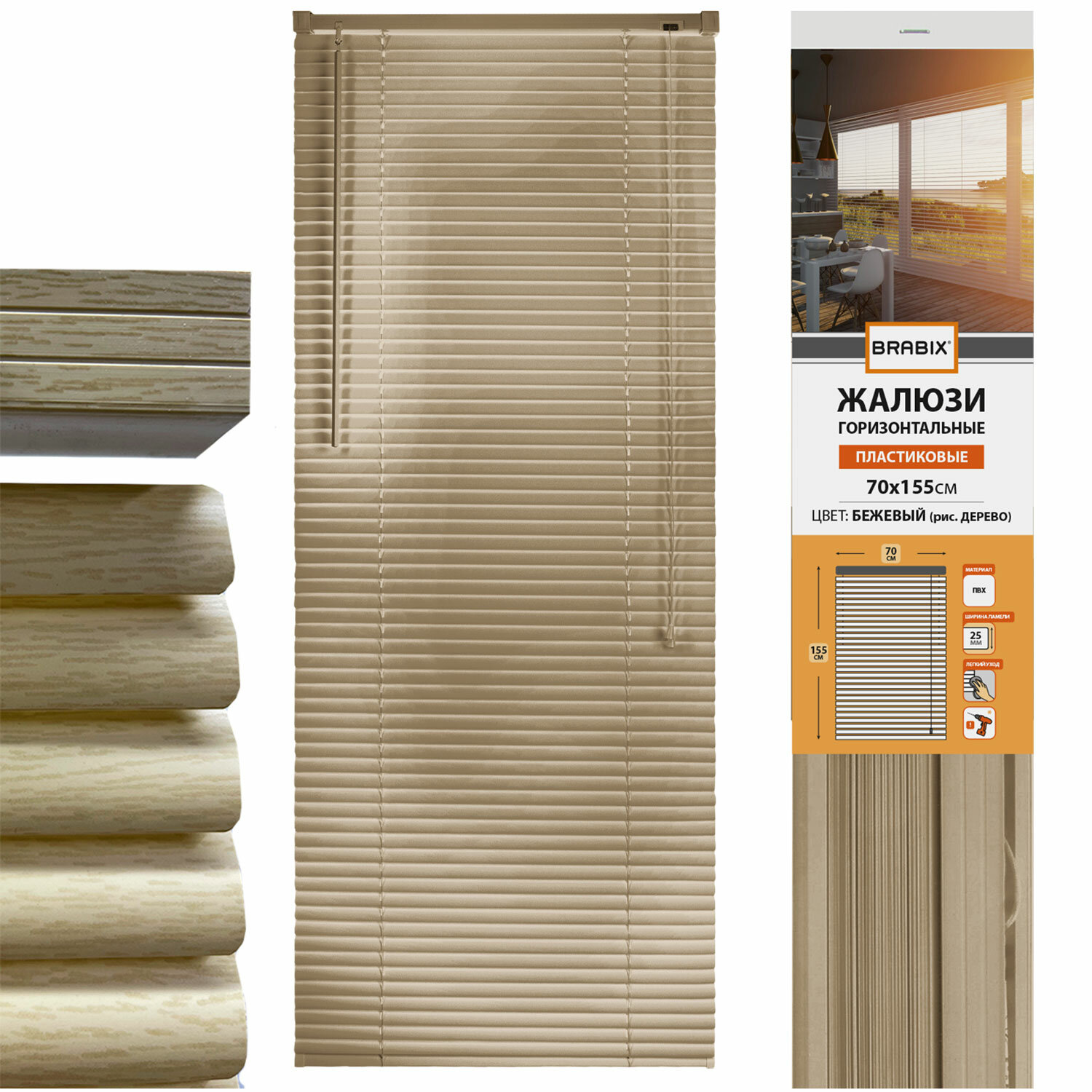 Жалюзи горизонтальные BRABIX 70х155 см, ПЛАСТИК, под дерево, бежевый Код товара: 608622 755,69 ₽ Купить Производитель:BRABIX Горизонтальные жалюзи BRABIX – это современное стильное и одновременно классическое решение для офисных и служебных помещений, также отлично впишутся в обстановку жилого дома и квартиры. Служат для защиты от солнца и регулировки светового потока. Изготовлены из высококачественного, стойкого к выцветанию пластика (ПВХ). Материал не склонен к деформациям и не чувствителен к воздействию влаги – такие жалюзи можно использовать в ванной комнате или на кухне. Простой и надежный механизм регулировки позволит легко управлять световым потоком в помещении. Жалюзи из ПВХ не требуют сложного ухода – достаточно протирать влажной салфеткой или губкой, либо использовать неагрессивные чистящие средства. Левой поворотной ручкой осуществляется управление световым потоком. Длина ручки – 70 см. Регулировка высоты осуществляется с помощью шнура управления справа. Также, есть возможность убрать лишние ламели. Последней прикреплена планка с утяжелителем для выравнивания расположения. Жалюзи выполнены в бежевом цвете, под дерево. Размер – 70х155 см. Ширина ламелей – 25 мм.Производство: КитайТип: горизонтальные жалюзиКоличество в комплекте: 1 шт.Серия: ЖалюзиМатериал: пластикШирина: 70 смВысота: 155 смЦвет: бежевый/под деревоТип монтажа: с помощью крепежаМеханизм регулировки: механическийСветонепроницаемость: -Назначение: универсальныеВес: 1,42 кгРазмер упаковки: 3.7 × 77.9 × 8.7 смОбъём: 0.0031 м3Промежуточная упаковка: 6 штТранспортная упаковка: 6 штШтрих-код: 4606224400600 Файлы Сертификат-1.jpg Сертификат-2.jpg Сертификат-3.jpg Сертификат-4.jpg Сертификат-5.jpg Сертификат-6.jpg Сертификат-7.jpg Сертификат-8.jpg Сертификат-9.jpg Сертификат-10.jpg Сертификат-11.jpg Сертификат-12.jpg Сертификат-13.jpg Сертификат-14.jpg Сертификат-15.jpg Сертификат-16.jpg Сертификат-17.jpg Сертификат-18.jpg Сертификат-19.jpg Сертификат-20.jpg Сертификат-21.jpg Сертификат-22.jpg Сертификат-23.jpg Сертификат-24.jpg Сертификат-25.jpg Сертификат-26.jpg