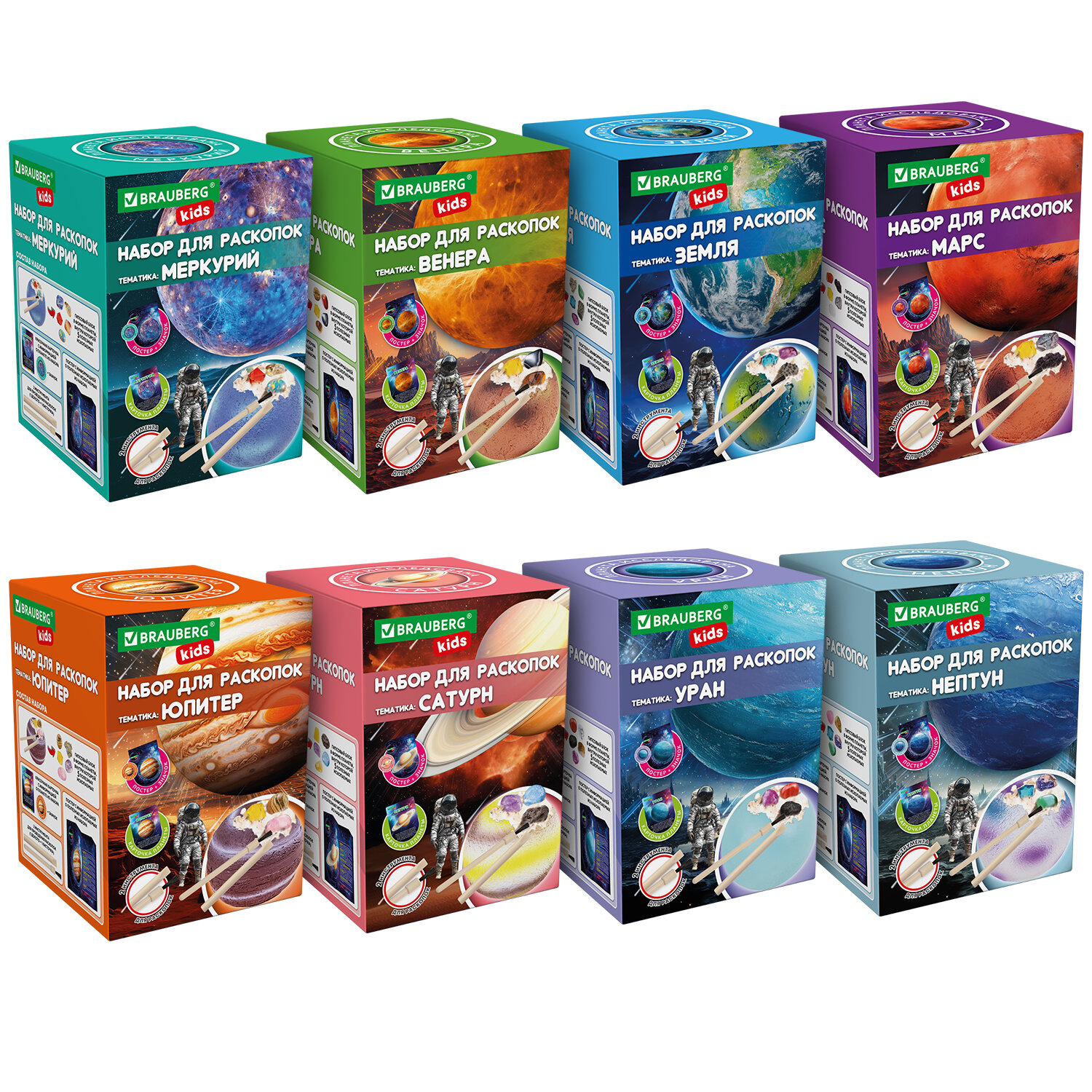 Набор для раскопок "Космос" 9,5х13,3 см, инструменты, 8 видов ассорти, BRAUBERG KIDS Код товара: 665919 242,78 ₽ Купить Производитель:BRAUBERG KIDS Отправьтесь в увлекательную космическую миссию, не выходя из дома! Научный набор "Космос" BRAUBERG KIDS для раскопок откроет перед юным астрономом двери в мир исследований далёких галактик. Что скрывает таинственный гипсовый блок? Вашему ребёнку предстоит провести раскопки и найти пять уникальных минералов, скрытых на одной из планет Солнечной системы. Это не просто игра, а увлекательное образовательное приключение, которое подарит часы захватывающего досуга и расширит кругозор. Что входит в набор? - Гипсовый блок для раскопок: прочная порода, которую содержит в себе уникальные минералы. - 5 минералов: камни разного цвета и фактуры - 2 профессиональных инструмента археолога: кисточка и долото помогут аккуратно и бережно извлечь каждую находку. - Познавательный буклет, представляющий собой красочный путеводитель по Солнечной системе, рассказывающий о планетах, их особенностях и интересных фактах. Ребёнок узнает, почему планеты имеет разный цвет и чем они уникальны. Почему этот набор понравится детям и родителям: - Этот набор погружает ребенка в удивительный мир астрономии, геологии и истории покорения космоса. - Он помогает развивать усидчивость и улучшает мелкую моторику. - Увлекательные открытия дарят радость и волнение.Производство: КитайТип товара: набор для раскопокВозраст ребенка: 3+Комплектация: долото, карточка, кисточкаКоличество предметов в наборе: 1Серия: наборы для раскопок ассортиСюжет: КосмосМатериал: гипсДлина: 9.5 смШирина: 9.5 смГлубина: 13.3 смУпаковка: красочная коробкаВес: 310 грРазмер упаковки: 9.8 × 13.7 × 9.8 смОбъём: 0.0018 м3Промежуточная упаковка: 8 штТранспортная упаковка: 48 штШтрих-код: 4606224474731 Файлы Сертификат-1.jpg Сертификат-2.jpg Сертификат-3.jpg Сертификат-4.jpg