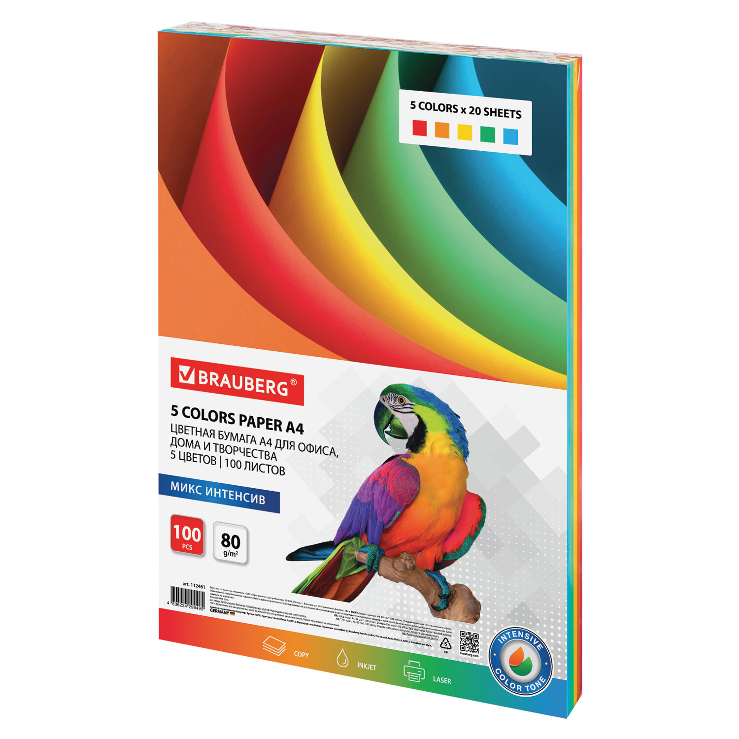Бумага цветная BRAUBERG, А4, 80 г/м2, 100 л. (5 цветов х 20 листов), интенсив, для офисной техники Код товара: 112461 274,75 ₽ Купить Производитель:BRAUBERG Цветная бумага BRAUBERG предназначена для использования в офисе и дома. Идеально подойдет для офисной техники, а также для детского творчества (изготовления поделок и аппликаций, оригами). Упакована в пачку из 100 листов формата А4. В упаковке бумага интенсивного тона 5 разных цветов: голубой, желтый, оранжевый, красный и зеленый. Листы бумаги плотностью 80 г/м2 подходят для офисной техники. Поставляется в упаковке «полибэг» (Polybag), которая представляет собой прочный прозрачный полиэтиленовый конверт, надежно защищающий бумагу при транспортировке. С одной стороны полибэг имеет заклеивающийся клапан, что предоставляет возможность многократно открывать и закрывать упаковку.Производство: РоссияФормат: А4Плотность: 80 г/м2Количество листов в пачке: 100Количество цветов в пачке: 5Тон: интенсивныйОттенок: ассортиДвусторонняя бумага: даСерия: Standard set intensiveКоличество пачек на палете: 1000 шт.Вес: 522 грРазмер упаковки: 1.1 × 29.8 × 21 смОбъём: 0.0009 м3Промежуточная упаковка: 10 штТранспортная упаковка: 10 штШтрих-код: 4606224299495 Файлы Сертификат-1.jpg Сертификат-2.jpg Сертификат-3.jpg Сертификат-4.jpg