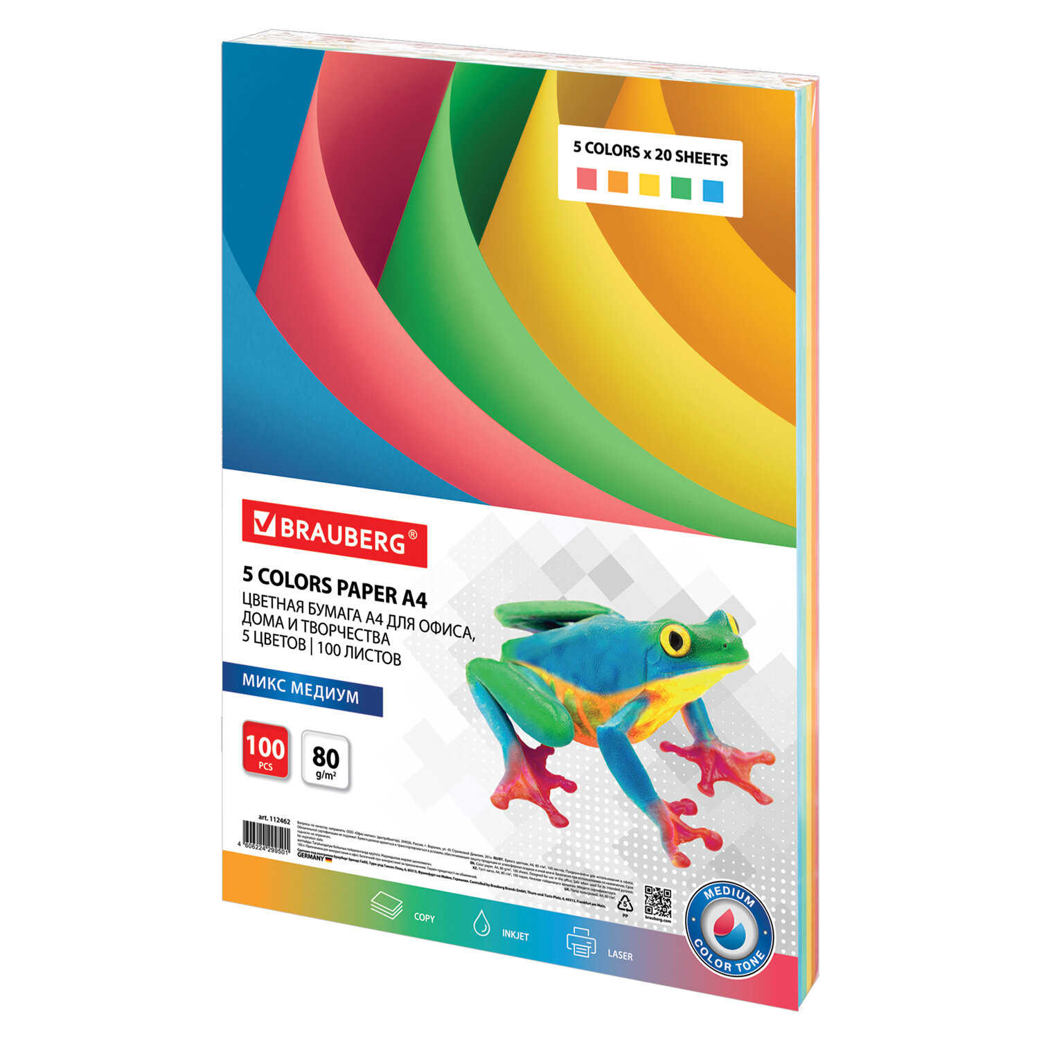 Бумага цветная BRAUBERG, А4, 80 г/м2, 100 л. (5 цветов х 20 листов), медиум, для офисной техники Код товара: 112462 272,16 ₽ Купить Производитель:BRAUBERG Цветная бумага BRAUBERG предназначена для использования в офисе и дома. Идеально подойдет для офисной техники, а также для детского творчества (изготовления поделок и аппликаций, оригами). Упакована в пачку из 100 листов формата А4. В упаковке бумага умеренно-насыщенного тона 5 разных цветов: голубой, желтый, оранжевый, розовый и зеленый. Листы бумаги плотностью 80 г/м2 подходят для офисной техники. Поставляется в упаковке «полибэг» (Polybag), которая представляет собой прочный прозрачный полиэтиленовый конверт, надежно защищающий бумагу при транспортировке. С одной стороны полибэг имеет заклеивающийся клапан, что предоставляет возможность многократно открывать и закрывать упаковку. Цветопередача монитора может искажать реальный цвет бумаги.Производство: РоссияФормат: А4Плотность: 80 г/м2Количество листов в пачке: 100Количество цветов в пачке: 5Тон: медиумОттенок: ассортиДвусторонняя бумага: даСерия: Standard set mediumКоличество пачек на палете: 1680 шт.Вес: 495 грРазмер упаковки: 1.1 × 29.7 × 21.1 смОбъём: 0.0009 м3Промежуточная упаковка: 10 штТранспортная упаковка: 10 штШтрих-код: 4606224299501 Файлы Сертификат-1.jpg Сертификат-2.jpg Сертификат-3.jpg Сертификат-4.jpg