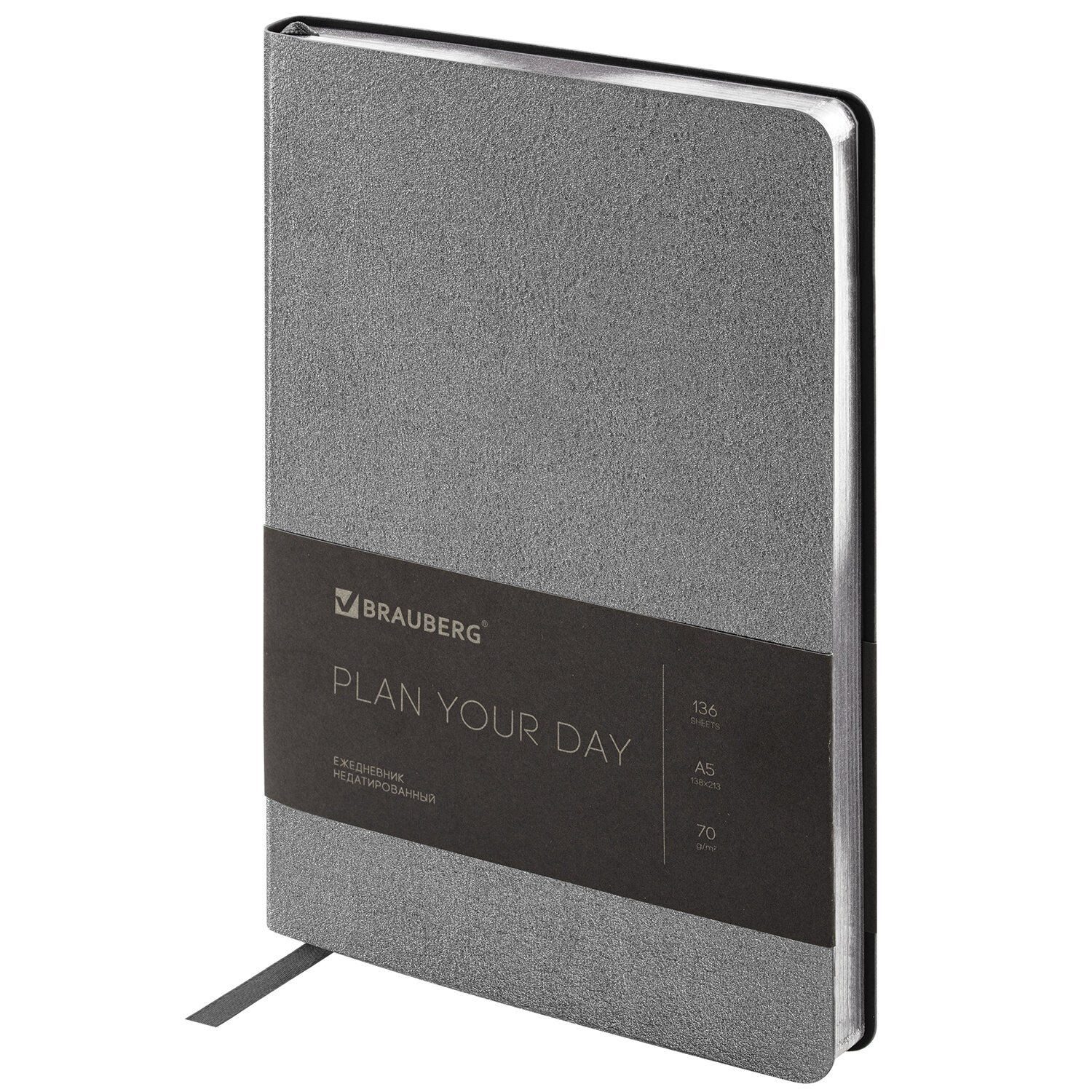 Ежедневник недатированный А5 138х213 мм BRAUBERG "Metallic", под кожу, 136 л., гибкий, серебряный Код товара: 113377 662,39 ₽ Купить Производитель:BRAUBERG Недатированный ежедневник BRAUBERG "Metallic" с оригинальной обложкой из искусственной кожи предназначен для энергичных людей, любящих нестандартные подходы к решению поставленных задач. Внутренний блок включает 136 листов белой бумаги плотностью 70 г/м2. Каждая страничка имеет перфорированный угол. Благодаря стандартному формату А5 (138х213 мм) ежедневник удобно использовать как в офисе, так и на выездных деловых встречах. Мягкая (интегральная) обложка стилизована под фактурную кожу с глянцевым отливом. Подходит для горячего тиснения. Дополнением является закладка-ляссе, с помощью которой при необходимости можно быстро открыть ежедневник на нужной странице. Помимо прочего ежедневник снабжен справочным материалом. В конце ежедневника есть 3 страницы для записей и заметок.Производство: КитайТип ежедневника: недатированныйФормат: А5Обложка: под фактурную кожу блескомВид обложки: интегральнаяКоличество листов: 136 шт.Особенности: закладка-ляссе, перфорация уголков, скругленные углы, справочная информацияСерия: MetallicТип застежки: нетОсновной цвет обложки: серебристыйДополнительный цвет обложки: нетЦвет среза: серебристыйЦвет внутреннего блока: белыйПлотность внутреннего блока: 70 г/м2Высота строки для записи: 4 ммТип крепления: сшивкаПечать блока: 2 краскиПодходит для блинтового тиснения: даПодходит для тиснения фольгой: даДлина: 213 ммШирина: 138 ммТолщина: 9 ммВес: 339 грРазмер упаковки: 1.6 × 21.3 × 14.2 смОбъём: 0.0006 м3Промежуточная упаковка: 30 штТранспортная упаковка: 30 штШтрих-код: 4606224333106 Файлы Сертификат-1.jpg Сертификат-2.jpg Сертификат-3.jpg Сертификат-4.jpg Сертификат-5.jpg Сертификат-6.jpg Сертификат-7.jpg Сертификат-8.jpg Сертификат-9.jpg Сертификат-10.jpg Сертификат-11.jpg Сертификат-12.jpg Сертификат-13.jpg Сертификат-14.jpg Сертификат-15.jpg Сертификат-16.jpg Сертификат-17.jpg Сертификат-18.jpg Сертификат-19.jpg Сертификат-20.jpg Сертификат-21.jpg Сертификат-22.jpg Сертификат-23.jpg Сертификат-24.jpg Сертификат-25.jpg Сертификат-26.jpg