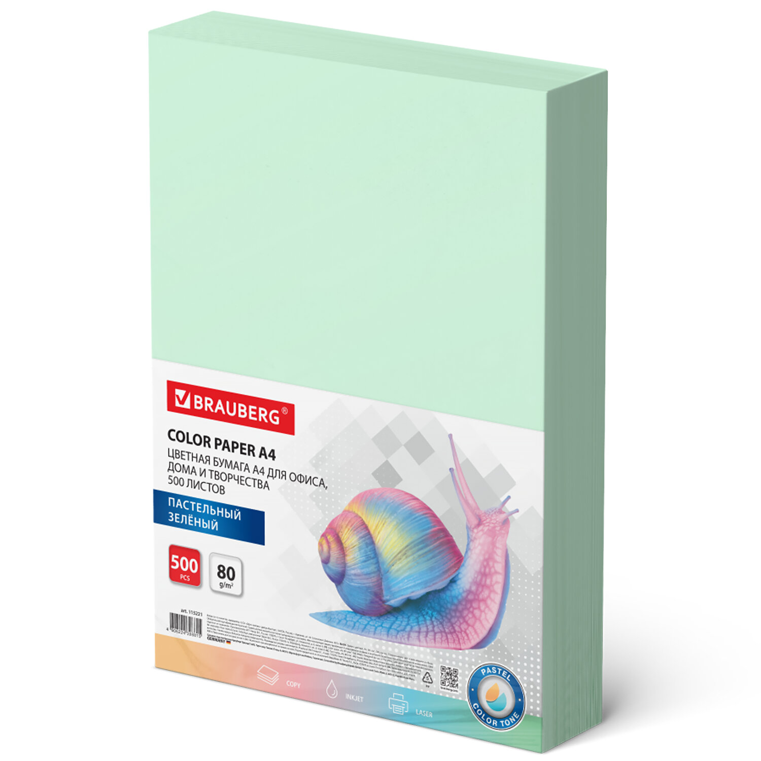 Бумага цветная BRAUBERG, А4, 80 г/м2, 500 л., пастель, зеленая, для офисной техники Код товара: 115221 1 091,18 ₽ Купить Производитель:BRAUBERG Цветная бумага BRAUBERG предназначена для использования в офисе и дома. Идеально подойдет для офисной техники, оформления писем и приглашений, в качестве разделителей для архивации, а также для детского творчества (изготовления поделок и аппликаций). Упакована в пачки по 500 листов формата А4. В упаковке бумага пастельного тона зеленого цвета. Листы бумаги плотностью 80 г/м2 подходят для офисной техники. Поставляется в упаковке "полибэг" (Polybag), которая представляет собой прочный прозрачный полиэтиленовый конверт надежно защищающий бумагу при транспортировке. Цветопередача монитора может искажать реальный цвет бумаги.Производство: РоссияФормат: А4Плотность: 80 г/м2Количество листов в пачке: 500Количество цветов в пачке: 1Тон: пастельныйОттенок: зеленыйДвусторонняя бумага: даСерия: Standard pastelКоличество пачек на палете: 360 шт.Вес: 2,54 кгРазмер упаковки: 5.3 × 30 × 21 смОбъём: 0.004 м3Промежуточная упаковка: 5 штТранспортная упаковка: 5 штШтрих-код: 4606224398815 Файлы Сертификат-1.jpg Сертификат-2.jpg Сертификат-3.jpg Сертификат-4.jpg