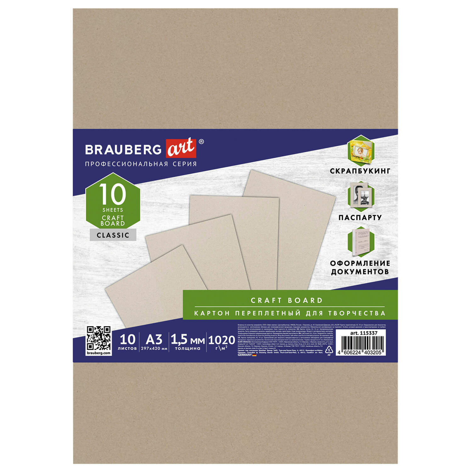 Картон переплетный, толщина 1,5 мм, А3 (297х420 мм), КОМПЛЕКТ 10 шт., BRAUBERG ART Код товара: 115337 323,06 ₽ Купить Производитель:BRAUBERG ART Перелетный картон BRAUBERG ART – это материал премиум качества, применяемый в разнообразных видах работ. Обладает высокой механической прочностью на разрыв и излом, не гибкий, не расслаивается, хорошо воспринимает клей, краску, скетч-маркеры. Переплетный картон формата А3 (297х420 мм), толщиной 1,5 мм и плотностью 1020 г/м2 поставляется в наборе по 10 штук. Используется в хобби и творчестве, полиграфии, скрапбукинге, моделировании, декупаже, в рисовании, в изготовлении обложек для полиграфической продукции, паспарту, творческих поделок, открыток, грунтованного холста, подшивке документов. Переплетный картон можно клеить, резать, сшивать, сверлить и т.д. Это практически универсальный материал, имеющий множество вариантов использования в руках мастера.Производство: РоссияФормат: А3Толщина: 1.5 ммКоличество в комплекте: 10 шт.Плотность: 1020 г/м2Цвет: СерыйУпаковка: полипропиленовый пакетСерия: ClassicДлина: 420 ммШирина: 297 ммВес: 1,34 кгРазмер упаковки: 1.6 × 42.1 × 31.4 смОбъём: 0.0024 м3Промежуточная упаковка: 5 штТранспортная упаковка: 5 штШтрих-код: 4606224403205 Файлы Сертификат-1.jpg Сертификат-2.jpg Сертификат-3.jpg Сертификат-4.jpg Сертификат-5.jpg Сертификат-6.jpg Сертификат-7.jpg Сертификат-8.jpg Сертификат-9.jpg Сертификат-10.jpg Сертификат-11.jpg Сертификат-12.jpg Сертификат-13.jpg Сертификат-14.jpg Сертификат-15.jpg Сертификат-16.jpg Сертификат-17.jpg Сертификат-18.jpg Сертификат-19.jpg Сертификат-20.jpg Сертификат-21.jpg Сертификат-22.jpg Сертификат-23.jpg Сертификат-24.jpg Сертификат-25.jpg Сертификат-26.jpg