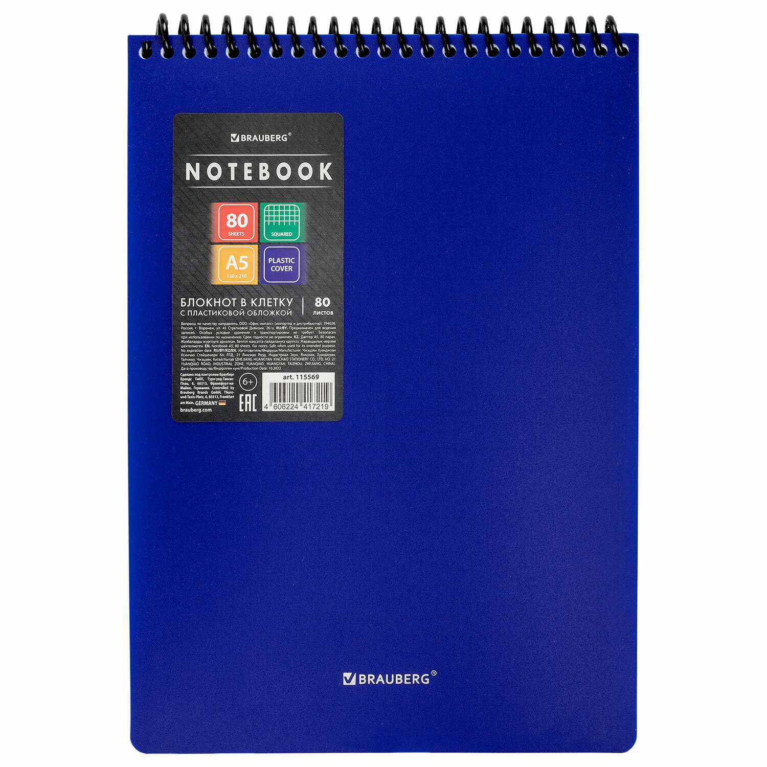 Блокнот А5 80 л., спираль пластиковая, обложка пластик, клетка, BRAUBERG "Metropolis", СИНИЙ Код товара: 115569 121,15 ₽ Купить Производитель:BRAUBERG BRAUBERG "Metropolis" – стильный блокнот для записей и заметок. Практичная пластиковая обложка долго сохраняет привлекательный внешний вид. Блокнот формата А5 на спирали содержит 80 листов с линовкой в клетку, что позволяет зафиксировать большой объем нужной информации. Имеет верхнее расположение переплета. Обложка выполнена из пластика, что делает блокнот более износоустойчивым. Внутренний блок состоит из белой офсетной бумаги плотностью 70 г/м2.Производство: КитайФормат: А5Количество листов: 80Тип обложки: пластикСкрепление блока: спиральРасположение переплета: верхнееЛиновка блока: клеткаСерия: MetropolisТип спецэффектов на обложке: тиснение фольгойВнутренний блок: офсетПлотность внутреннего блока: 70 г/м2Цвет внутреннего блока: белыйШирина: 150 ммДлина: 210 ммЦвет обложки: синийДизайн обложки: ОднотонныйКоличество дизайнов в упаковке: 1 шт.Индивидуальная упаковка: даВес: 209 грРазмер упаковки: 1.3 × 21.6 × 14.9 смОбъём: 0.0004 м3Промежуточная упаковка: 50 штТранспортная упаковка: 50 штШтрих-код: 4606224417219 Сертификат-1.jpg Сертификат-2.jpg Сертификат-3.jpg