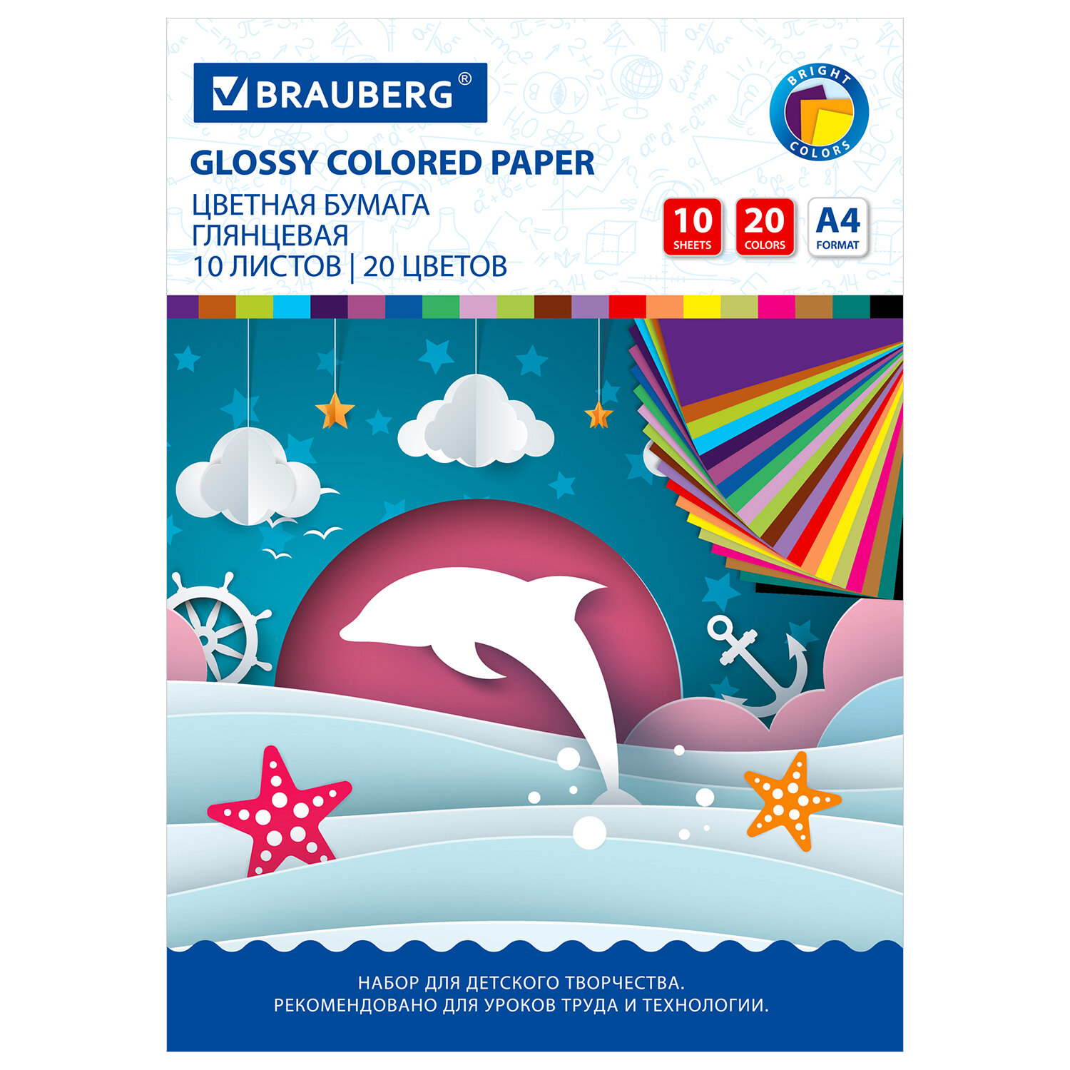 Цветная бумага А4 ДВУХЦВЕТНАЯ МЕЛОВАННАЯ, 10 листов, 20 цветов, в папке, BRAUBERG, 200х280 мм, "Дельфин" Код товара: 129923 106,74 ₽ Купить Производитель:BRAUBERG Цветная бумага BRAUBERG предназначена для творчества и хобби и может использоваться, начиная с трехлетнего возраста, для развития моторики и фантазии ребенка. Набор мелованной (глянцевой) двусторонней цветной бумаги плотностью 80 г/м2 включает 10 листов формата А4 (200х280 мм) в 20-ти разнообразных и насыщенных однородных цветах. Листы упакованы в картонную папку, легко режутся и сгибаются.Производство: РоссияТип бумаги: глянцевая, двусторонняяВнутренний блок: мелованныйФормат: А4Количество листов: 10Количество цветов: 20Тип скрепления: в папкеТип товара: бумага цветная мелованная 2-сторонняяПлотность бумаги: 80 г/м2Прокрас бумаги: с 2 сторонДизайн: ДельфинШирина: 200 ммДлина: 280 ммОбложка: мелованный картонУпаковка: папкаВес: 77 грРазмер упаковки: 0.2 × 28.6 × 20.6 смОбъём: 0.0001 м3Промежуточная упаковка: 70 штТранспортная упаковка: 70 штШтрих-код: 4606224226415 Файлы Сертификат-1.jpg Сертификат-2.jpg Сертификат-3.jpg Сертификат-4.jpg Сертификат-5.jpg Сертификат-6.jpg