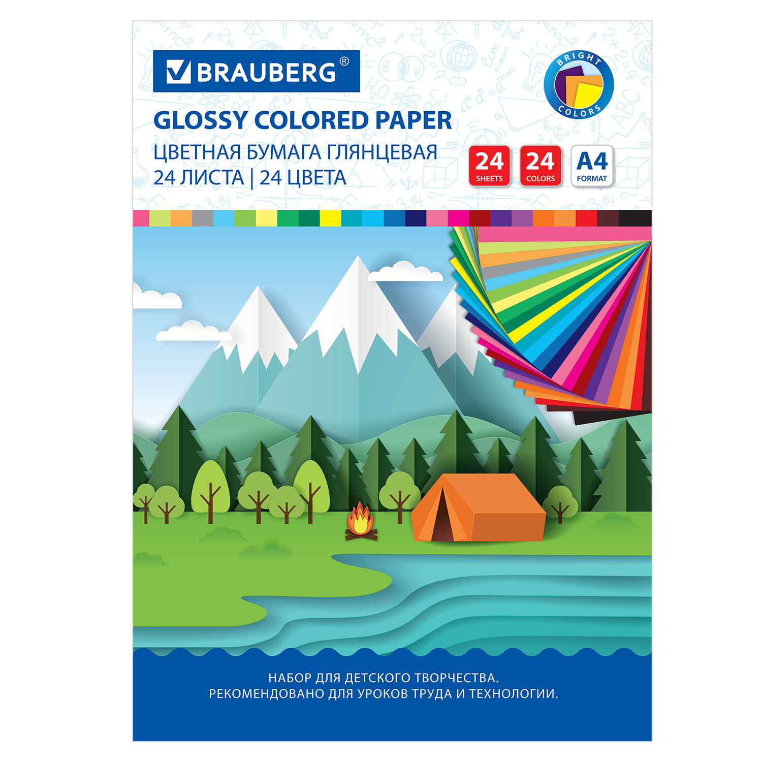 Цветная бумага А4 мелованная (глянцевая), 24 листа 24 цвета, на скобе, BRAUBERG, 200х280 мм, "Путешествие" Код товара: 129929 102,33 ₽ Купить Производитель:BRAUBERG Цветная бумага BRAUBERG предназначена для творчества и хобби и может использоваться, начиная с трехлетнего возраста, для развития моторики и фантазии ребенка. Набор мелованной (глянцевой) односторонней цветной бумаги плотностью 60 г/м2 включает 24 листа формата А4 (200х280 мм) в 24 разнообразных и насыщенных однородных цветах. Листы скреплены скобами, легко режутся и сгибаются.Производство: РоссияТип бумаги: глянцевая, односторонняяВнутренний блок: мелованныйФормат: А4Количество листов: 24Количество цветов: 24Тип скрепления: скобаТип товара: бумага цветная мелованнаяПлотность бумаги: 60 г/м2Прокрас бумаги: с 1 стороныДизайн: ПутешествиеШирина: 200 ммДлина: 280 ммОбложка: мелованная бумагаУпаковка: нетВес: 125 грРазмер упаковки: 0.2 × 27.8 × 19.8 смОбъём: 0.0001 м3Промежуточная упаковка: 60 штТранспортная упаковка: 60 штШтрих-код: 4606224226477 Сертификат-1.jpg Сертификат-2.jpg Сертификат-3.jpg