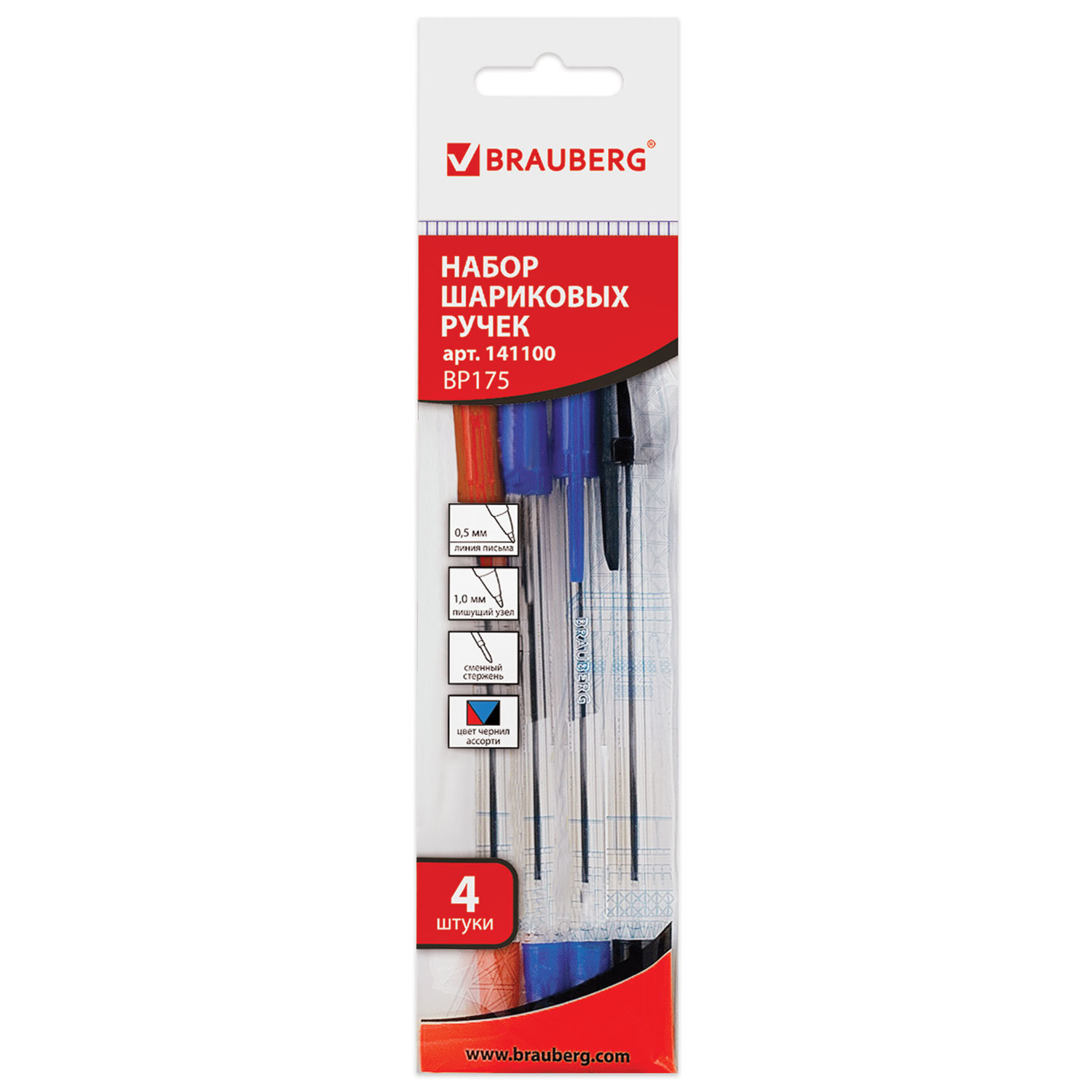 Ручки шариковые BRAUBERG, НАБОР 4 шт., АССОРТИ, "Line", узел 1 мм, линия письма 0,5 мм Код товара: 141100 84,43 ₽ Купить Производитель:BRAUBERG Набор шариковых ручек BRAUBERG "Line" - это предмет, который всегда должен быть под рукой: во время важных переговоров в офисе, на диктанте в школе, во время лекции в ВУЗе и даже дома! Набор из 4 штук в прозрачном корпусе с деталями в цвет чернил. Сменный стержень длиной 152 мм. Диаметр пишущего узла 1,0 мм создает тонкую инию письма 0,5 мм. В набор входят 2 ручки с синими чернилами, 1 ручка с черными чернилами и 1 ручка с красными чернилами. Лаконичный дизайн соответствует офисному стилю.Производство: КитайЦвет чернил: ассортиКоличество в комплекте: 4 шт.Толщина линии письма: 1 ммДиаметр пишущего узла: 0.5 ммФорма наконечника: стандартныйДлина сменного стержня: 152 ммСерия: LineСтиль: для офиса и учебыЦвет корпуса: прозрачныйДизайн: без дизайнаФорма корпуса: круглаяПокрытие корпуса: -Упаковка: блистер с подвесомСрок годности: 48 месВес: 28 грРазмер упаковки: 1 × 16.7 × 4.8 смОбъём: 0.0001 м3Промежуточная упаковка: 24 штТранспортная упаковка: 144 штШтрих-код: 4606224026848 Файлы Сертификат-1.jpg Сертификат-2.jpg Сертификат-3.jpg Сертификат-4.jpg