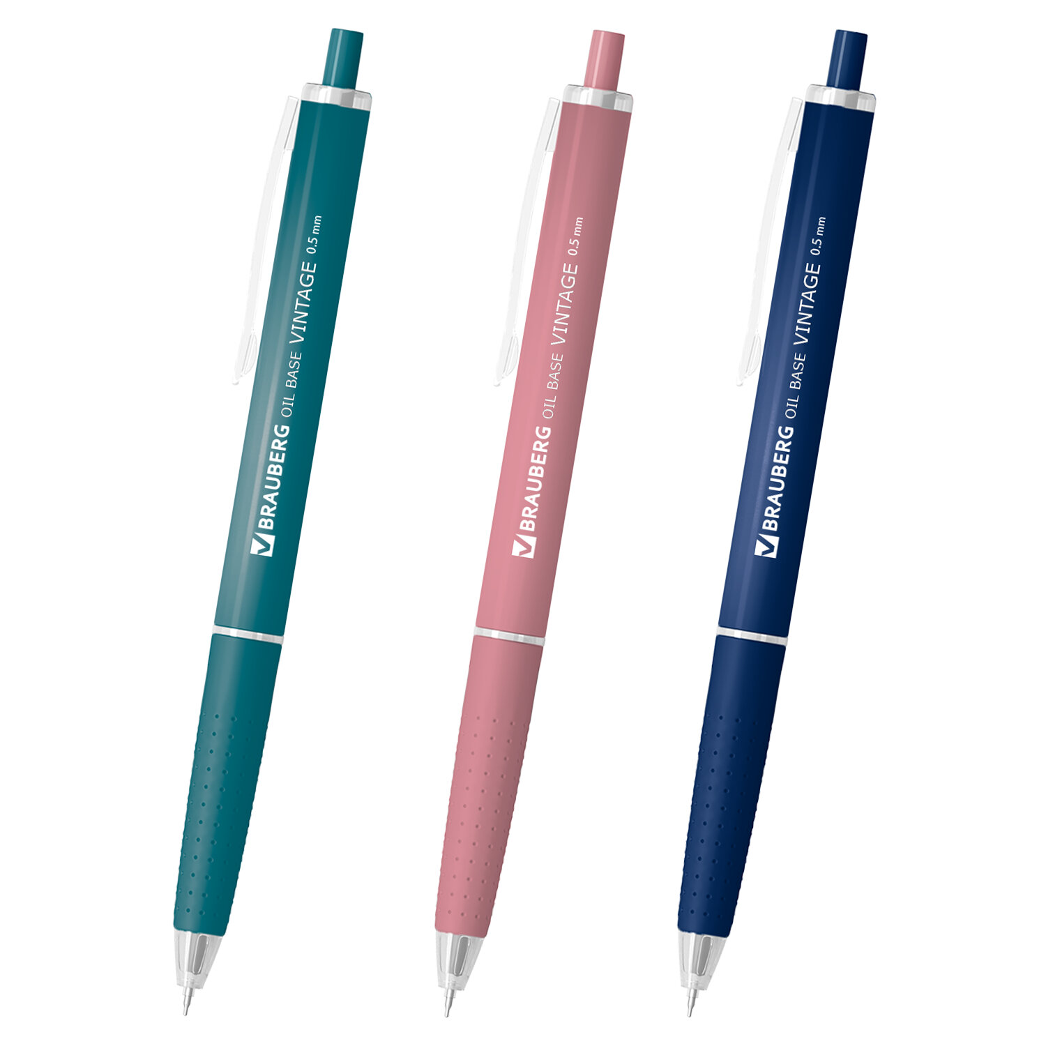 Ручка шариковая автоматическая BRAUBERG "OIL-BASE VINTAGE", корпус ассорти, СИНЯЯ, пишущий узел 0,5 мм, линия письма 0,3 мм