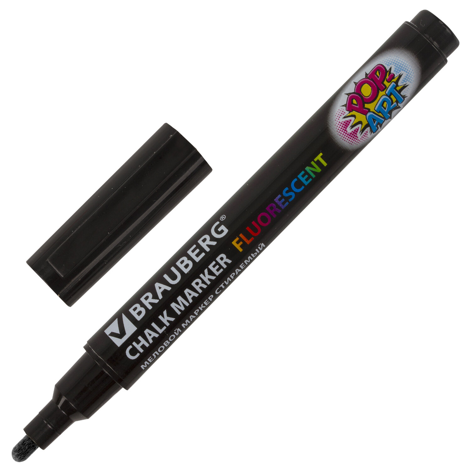 Маркер меловой "POP-ART" ЧЕРНЫЙ, 3,5 мм, стираемый, для гладких поверхностей, BRAUBERG Код товара: 151525 133,56 ₽ Купить Производитель:BRAUBERG Сухостираемый меловой маркер BRAUBERG "POP-ART" - оригинальный инструмент для оформления различных зон помещений. Идеален для использования на школьных занятиях и детского творчества. СПОСОБ ПРИМЕНЕНИЯ: 1. Перед использованием хорошо встряхнуть с закрытым колпачком. 2. Снять колпачок, надавить на наконечник, дождаться, когда чернила полностью пропитают его. 3. После использования плотно закрыть колпачок. Предназначен для росписи, создания рисунков и надписей на зеркалах, стекле, меловой пленке и прочих гладких и прозрачных невпитывающих поверхностях. Рисунок получается плотный и яркий. Чернила на водно-меловой основе черного цвета без резкого запаха. Толщина линии письма - от 1 мм до 3,5 мм, зависит от угла наклона мелового маркера. Круглый корпус выполнен из пластика. Обладает следующими преимуществами: - чернила светятся в УФ-свете; - повышенная светостойкость; - пулевидный наконечник устойчив к повреждению и истиранию.Производство: КитайЦвет чернил: черныйСерия: POP-ART 3,5 ммКоличество в комплекте: 1 шт.Форма наконечника: пулевидныйМинимальная толщина линии письма: 1 ммМаксимальная толщина линии письма: 3.5 ммСпецэффект чернил: -Чернила светятся в УФ-свете: даПовышенная светостойкость: даНаконечник устойчив к повреждению и истиранию: даТип стирания: сухостираемыйФорма корпуса: круглаяДиаметр корпуса: 12 ммМатериал корпуса: пластикОснова чернил: меловаяУпаковка: картонная коробкаСрок годности: 48 месВес: 14 грРазмер упаковки: 1.2 × 13.1 × 1.2 смОбъём: 0.0001 м3Промежуточная упаковка: 10 штТранспортная упаковка: 800 штШтрих-код: 4606224226637 Сертификат-1.jpg Сертификат-2.jpg Сертификат-3.jpg
