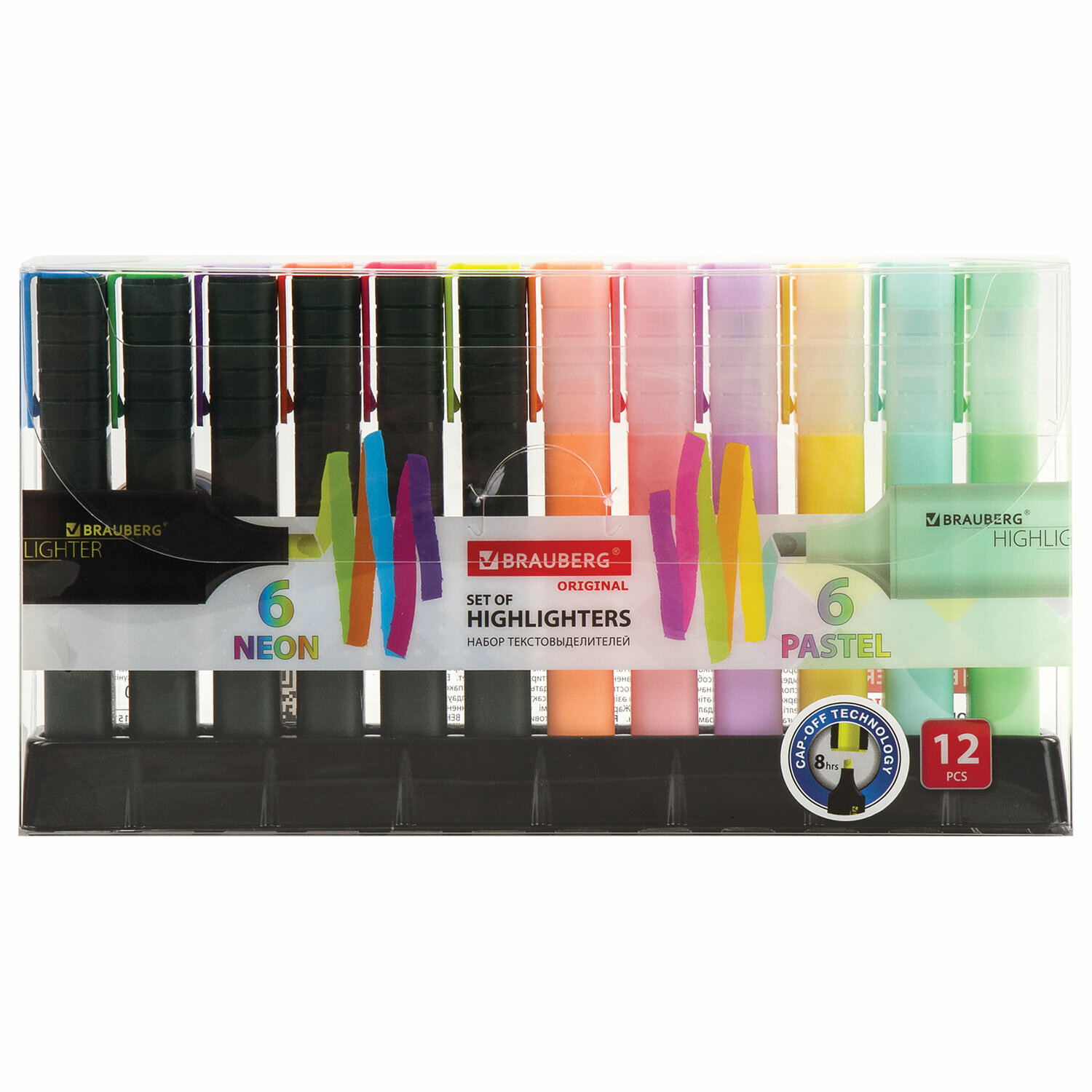 Набор текстовыделителей 12 ЦВЕТОВ на подставке, BRAUBERG "ORIGINAL", линия письма 1-5 мм Код товара: 151699 480,68 ₽ Купить Производитель:BRAUBERG Текстовыделители BRAUBERG "ORIGINAL" предназначены для выделения текста на бумаге любого типа, включая факс-бумагу. В наборе 12 цветов: – 6 неоновых цветов: фиолетовый, голубой, зеленый, желтый, оранжевый, розовый; – 6 пастельных цветов: лавандовый, бирюзовый, мятный, ванильный, персиковый, пастельный розовый. Неоновый цвет позволяет ярко выделить важное в тексте, в то время как особый пастельный оттенок создает мягкие переходы и равномерно подчеркивает необходимую информацию. В комплекте подставка длиной 21 см, которая позволяет удобно расположить набор на столе и обеспечить быстрый доступ к каждому текстовыделителю. Плоская форма корпуса, диаметр которого 25 мм. Скошенный наконечник имеет толщину линии письма от 1 до 5 мм, что обеспечивает удобство при работе с текстом, напечатанным мелким шрифтом, или таблицами. Благодаря особой водной основе чернил текстовыделители не высыхают без колпачка в течение 8 часов. Текстовыделители обладают экономным расходом чернил, при этом длина линии письма достигает 300 метров. Чернила быстро впитываются и тем самым предотвращают размазывание в процессе использования. Цвет клипа и корпуса соответствует цвету чернил.Производство: КитайЦвет чернил: ассортиКоличество в комплекте: 12 шт.Форма наконечника: скошенныйСпецэффект цвета чернил : неоновый, пастельныйОснова чернил: воднаяСерия: OriginalМин. толщина линии письма: 1 ммМакс. толщина линии письма: 5 ммФорма корпуса: плоскаяДиаметр корпуса: 25 ммНаличие клипа: даУпаковка: пластиковый футляр с европодвесомСрок годности: 36 месВес: 298 грРазмер упаковки: 3.9 × 21.9 × 12.1 смОбъём: 0.0013 м3Промежуточная упаковка: 6 штТранспортная упаковка: 54 штШтрих-код: 4606224266589 Сертификат-1.jpg Сертификат-2.jpg Сертификат-3.jpg