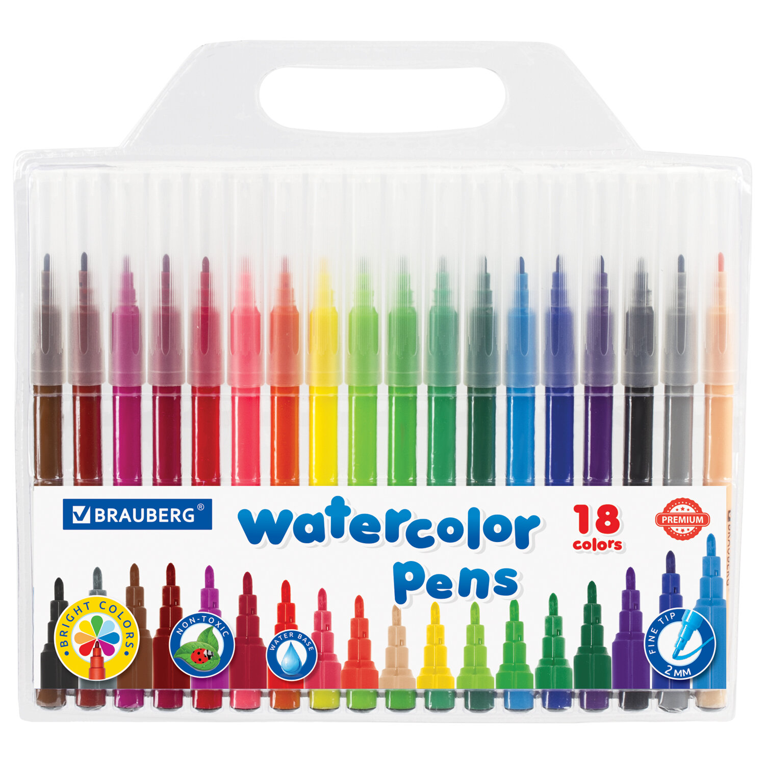 Фломастеры BRAUBERG "PREMIUM", 18 цветов, КЛАССИЧЕСКИЕ, вентилируемый колпачок, ПВХ-упаковка с европодвесом Код товара: 151935 208,89 ₽ Купить Производитель:BRAUBERG Набор фломастеров BRAUBERG "PREMIUM" с насыщенными, яркими цветами в количестве 18 штук. Чернила на водной основе практически не имеют запаха, не токсичны и легко смываются с большинства материалов и тканей. Имеют удобную круглую форму. Длина корпуса - 150 мм, диаметр - 8,2 мм. Благодаря линии письма 1-2 мм процесс раскрашивания становится легким и приятным. Быстросохнущие чернила предотвращают смазывание рисунка. Благодаря полипропиленовому корпусу срок службы фломастеров значительно увеличивается. Колпачок имеет специальные прорези для вентиляции. Фломастеры обладают экономным расходом чернил, при этом длина линии письма достигает 500 метров. Рекомендованы для детей от 3-х лет. Рисование фломастерами BRAUBERG "PREMIUM" способствует развитию воображения, мелкой моторики рук у детей, координации движений кистей и пальцев и повышает способность концентрироваться и фокусировать внимание.Производство: КитайКоличество цветов: 18Форма корпуса: круглаяЭффект чернил: без эффектаТип чернил: легкосмываемыеСерия: PREMIUM CLASSICШирина линии письма: 1 ммПишущий узел: 2 ммДлина письма: 500 мДлина корпуса: 150 ммДиаметр корпуса: 8.2 ммВентилируемый колпачок: даУпаковка: ПВХ-конверт с европодвесомСрок годности: 48 месВес: 137 грРазмер упаковки: 1.1 × 20.2 × 18.8 смОбъём: 0.0005 м3Промежуточная упаковка: 12 штТранспортная упаковка: 96 штШтрих-код: 4606224283968 Сертификат-1.jpg Сертификат-2.jpg Сертификат-3.jpg
