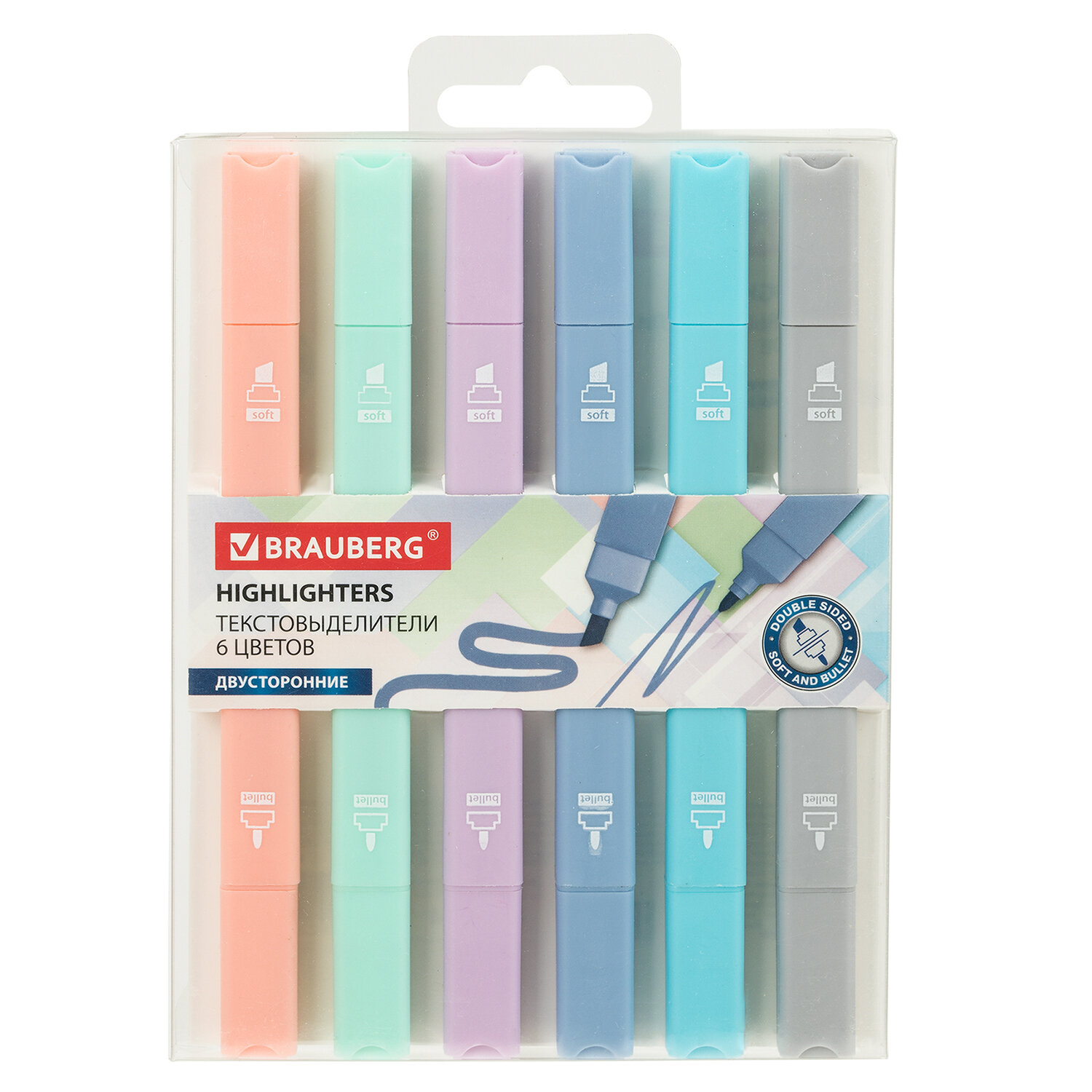 Набор текстовыделителей двусторонних 6 ПАСТЕЛЬНЫХ ЦВЕТОВ, BRAUBERG "Macaroon", линия 1-5 мм Код товара: 152513 278,19 ₽ Купить Производитель:BRAUBERG Двусторонние текстовыделители BRAUBERG "Macaroon" предназначены для выделения текста на бумаге любого типа. Идеально подходят для скетчинга, а также решения учебных, домашних и офисных задач. В наборе 6 двусторонних текстовыделителей пастельных цветов – серый макарун, бирюзовый, монохромный синий, лавандовый, мятный, коралловый. Нежные пастельные цвета позволяют создать мягкие переходы и равномерно подчеркнуть необходимую информацию в тексте. Цвет корпуса соответствует цвету чернил. Текстовыделители имеют корпус прямоугольной формы диаметром 12 мм. Одна сторона имеет мягкий скошенный наконечник с линией письма от 1 до 5 мм, что обеспечивает ровное непрерывное нанесение при работе с текстом, напечатанным мелким шрифтом, или таблицами. Вторая сторона имеет пулевидный наконечник, с помощью которого можно рисовать или закрашивать различные рисунки или надписи. Благодаря особой водной основе чернил текстовыделители не высыхают без колпачка в течение 8 часов. Текстовыделители обладают экономным расходом чернил, не портят бумагу, не смазывают текст и не просвечиваются.Производство: КитайЦвет чернил: пастельный ассортиКоличество в комплекте: 6 шт.Форма наконечника: скошенный/пулевидныйСпецэффект цвета чернил : пастельныйОснова чернил: воднаяДвусторонний: даСерия: Macaroon / MorandiМин. толщина линии письма: 1 ммМакс. толщина линии письма: 5 ммФорма корпуса: прямоугольнаяДиаметр корпуса: 12 ммУпаковка: пластиковая упаковка с европодвесомСрок годности: 60 месВес: 87 грРазмер упаковки: 1.2 × 15.1 × 11.4 смОбъём: 0.0003 м3Промежуточная упаковка: 80 штТранспортная упаковка: 160 штШтрих-код: 4606224410999 Сертификат-1.jpg Сертификат-2.jpg Сертификат-3.jpg
