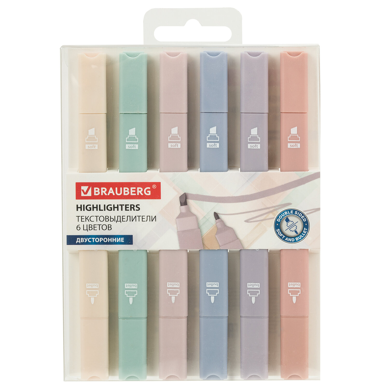 Набор текстовыделителей двусторонних 6 ЦВЕТОВ МОРАНДИ, BRAUBERG "Morandi", линия 1-5 мм Код товара: 152514 274,23 ₽ Купить Производитель:BRAUBERG Двусторонние текстовыделители BRAUBERG "Morandi" предназначены для выделения текста на бумаге любого типа. Идеально подходят для скетчинга, а также решения учебных, домашних и офисных задач. В наборе 6 двусторонних текстовыделителей цветов моранди – миндальный, кирпично-розовый, темный серовато-синий, льняной, пыльно-зеленый, кремовый. Нежные и приглушенные цвета Моранди позволяют создать мягкие переходы и равномерно подчеркнуть необходимую информацию в тексте. Цвет корпуса соответствует цвету чернил. Текстовыделители имеют корпус прямоугольной формы диаметром 12 мм. Одна сторона имеет мягкий скошенный наконечник с линией письма от 1 до 5 мм, что обеспечивает ровное, непрерывное нанесение при работе с текстом, напечатанным мелким шрифтом, или таблицами. Вторая сторона имеет пулевидный наконечник, с помощью которого можно рисовать или закрашивать различные рисунки или надписи. Благодаря особой водной основе чернил текстовыделители не высыхают без колпачка в течение 8 часов. Текстовыделители обладают экономным расходом чернил, не портят бумагу, не смазывают текст и не просвечиваются.Производство: КитайЦвет чернил: разноцветныйКоличество в комплекте: 6 шт.Форма наконечника: скошенный/пулевидныйСпецэффект цвета чернил : пастельныйОснова чернил: воднаяДвусторонний: даСерия: Macaroon / MorandiМин. толщина линии письма: 1 ммМакс. толщина линии письма: 5 ммФорма корпуса: прямоугольнаяДиаметр корпуса: 12 ммУпаковка: пластиковая упаковка с европодвесомСрок годности: 60 месВес: 87 грРазмер упаковки: 1.2 × 15.1 × 11.3 смОбъём: 0.0003 м3Промежуточная упаковка: 80 штТранспортная упаковка: 160 штШтрих-код: 4606224411002 Сертификат-1.jpg Сертификат-2.jpg Сертификат-3.jpg