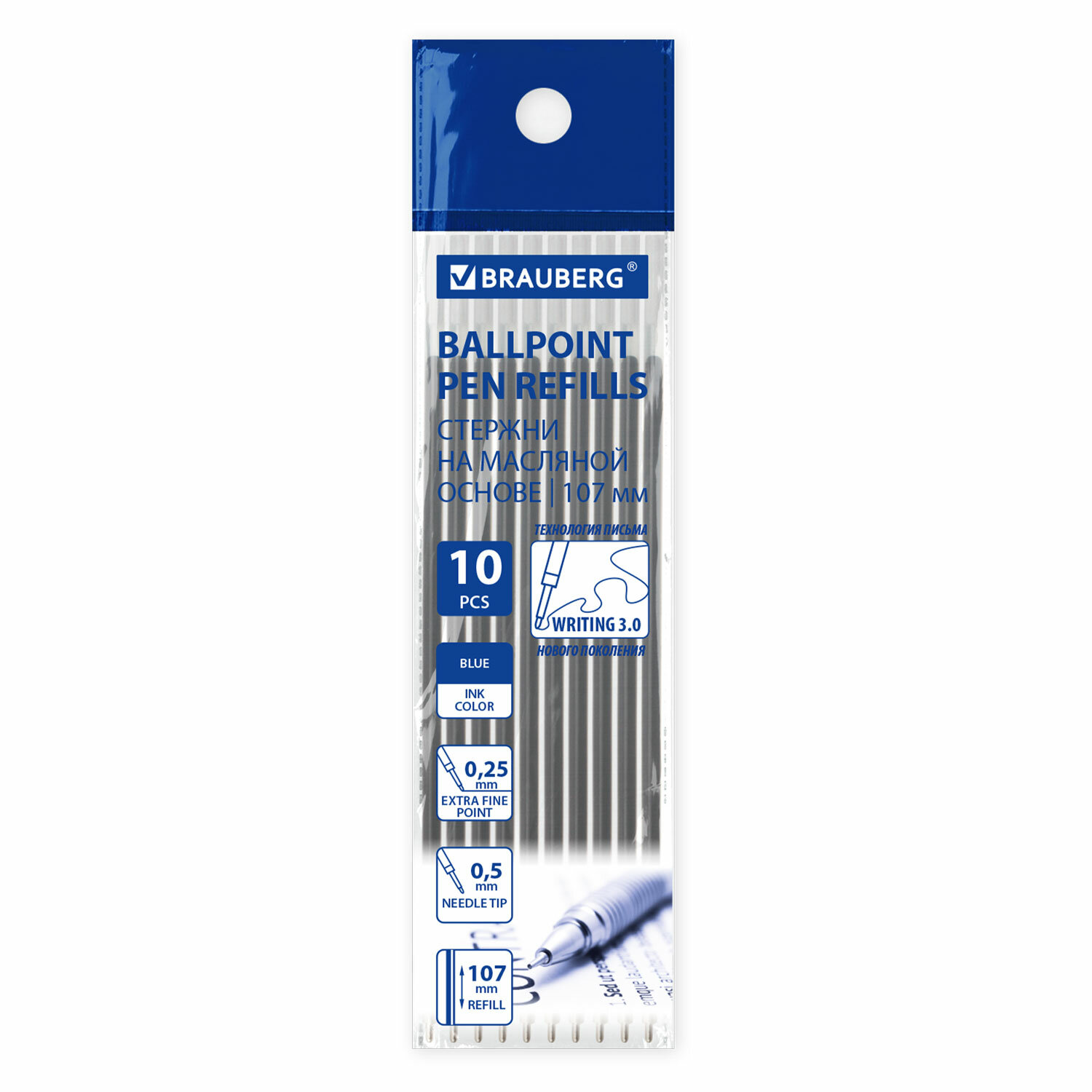 Стержни шариковые масляные с ушками BRAUBERG "WRITING 3.0", 107 мм, КОМПЛЕКТ 10 ШТ., СИНИЕ, игольчатый узел 0,5 мм Код товара: 170415 41,57 ₽ Купить Производитель:BRAUBERG Сменный стержень для шариковых автоматических ручек BRAUBERG обеспечивает тонкое и ровное письмо. Набор из 10 классических стержней для автоматических ручек. Преимущество стержня на масляной основе в технологии "WRITING 3.0" обеспечивает плавное и гладкое письмо. Длина стержня 107 мм. Игольчатый наконечник 0,5 мм создает тонкую линию письма равную 0,25 мм. Стержень идеально подходит к серии автоматических ручек BRAUBERG A-30.Производство: КитайТип стержня: с ушкамиДлина стержня: 107 ммДля автоматических ручек: даЦвет чернил: синийЧернила на масляной основе: даТолщина линии письма: 0.25 ммСерия: WRITING 3.0.Диаметр пишущего узла: 0.5 ммТип наконечника: игольчатыйМатериал корпуса: пластикКоличество в комплекте: 10 шт.Упаковка: пакет с подвесомСрок годности: 60 месВес: 10 грРазмер упаковки: 0.3 × 12.4 × 3.8 смПромежуточная упаковка: 20 штТранспортная упаковка: 480 штШтрих-код: 4606224455297 Сертификат-1.jpg Сертификат-2.jpg Сертификат-3.jpg