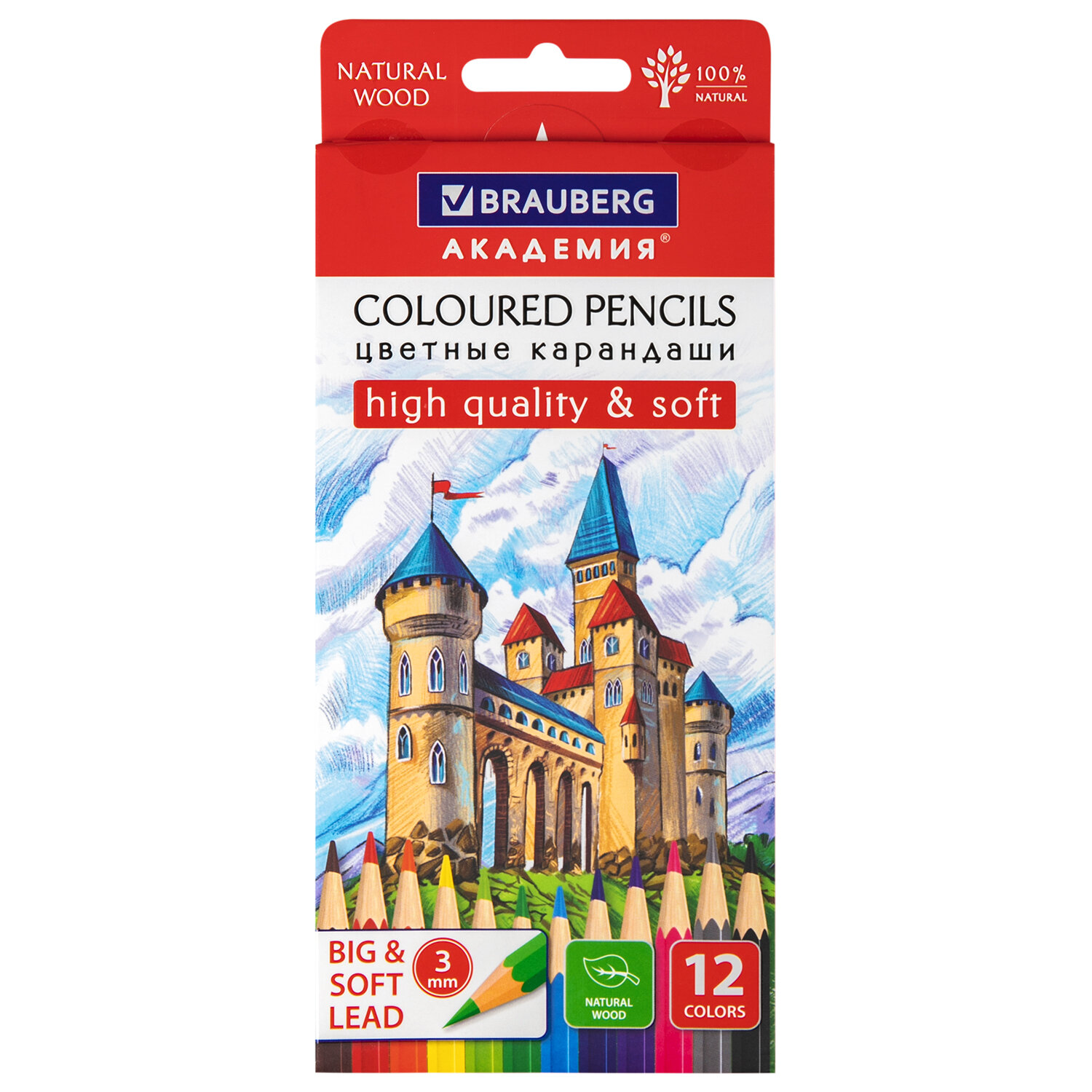 Карандаши цветные мягкие BRAUBERG АКАДЕМИЯ, 12 цветов, шестигранные, грифель 3 мм, натуральное дерево Код товара: 181864 156,42 ₽ Купить Производитель:BRAUBERG Шестигранные деревянные цветные карандаши высокого качества BRAUBERG АКАДЕМИЯ обеспечивают гладкое письмо благодаря мягкому грифелю. Особое качество красящего пигмента делает цвета яркими и насыщенными. В наборе 12 цветов: черный, синий, голубой, салатовый, зеленый, желтый, оранжевый, розовый, красный, серый, фиолетовый, коричневый. Шестигранная форма корпуса позволяет карандашу не скатываться с поверхности стола во время занятий рисованием. Карандаши изготовлены из древесины ценных пород и имеют лакированный корпус. Высокосортная древесина и качество исполнения гарантируют легкую заточку. Грифель диаметром 3 мм обладает повышенной прочностью. Все карандаши заточены и поставляются в картонной упаковке с европодвесом. Рисование цветными карандашами способствует развитию творческого мышления, мелкой моторики рук, цветового восприятия, фантазии и воображения ребенка.Производство: КитайКоличество цветов: 12 шт.Количество карандашей: 12 шт.Серия: АкадемияФорма сечения корпуса: шестиграннаяМатериал корпуса: деревоЛакированный корпус: даГрифель повышенной прочности: даЗаточка грифеля: даЛегко затачиваются: даДиаметр грифеля: 3 ммДлина карандаша: 176 ммУпаковка: картонная коробка c европодвесомВес: 81 грРазмер упаковки: 0.7 × 20.3 × 8.8 смОбъём: 0.0002 м3Промежуточная упаковка: 12 штТранспортная упаковка: 240 штШтрих-код: 4606224328744 Сертификат-1.jpg Сертификат-2.jpg Сертификат-3.jpg