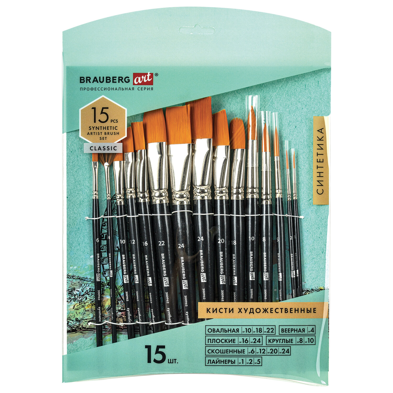 Кисти изготовлены с применением синтетики. Отличаются универсальностью в использовании, обусловленной упругостью ворса и прекрасными впитывающими свойствами пучка. Короткая ручка из древесины покрыта лаком, что защищает ее от воздействия красок и влаги. Форма пучка - овальная № 10, 18, 22; веерная № 4; плоская № 16, 24; круглая № 8, 10; скошенная № 6, 12, 20, 24; лайнер №1, 2, 5. Номер кисти соответствует реальной ширине пучка в миллиметрах. Упаковка - ПВХ с европодвесом и картонной подложкой.