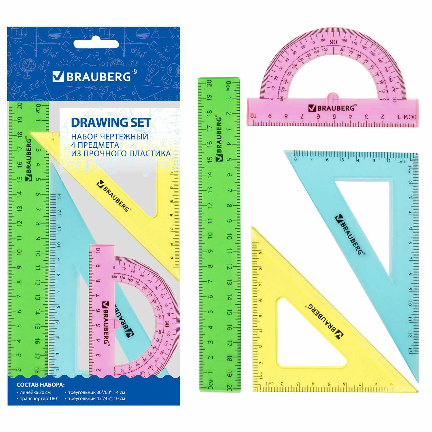 Набор чертежный средний BRAUBERG "Crystal" (линейка 20 см, 2 угольника, транспортир), цветной Код товара: 210296 160,8 ₽ Купить Производитель:BRAUBERG Набор чертежный геометрический BRAUBERG предназначен для выполнения чертежных работ. В набор входит: - линейка со шкалами 20 см/20 см"; - угольник с углами 30°/60° и шкалами 14,5 см/8,5 см; - угольник с углами 45°/45° и шкалами 10 см/10 см; - транспортир 180° и шкалой 10 см. Изготовлен из яркого прочного цветного пластика толщиной 1,6-2 мм. Цвет - ассорти. Поставляется в пакете с европодвесом.Производство: КитайКоличество предметов в наборе: 4 шт.Максимальная длина разметки: 20 смКомплектация: большой треугольник, линейка, малый треугольник, транспортирМатериал: пластикПрозрачный: даЦвет: ассортиСерия: CrystalУпаковка: пакет с европодвесомВес: 40 грРазмер упаковки: 0.9 × 21.1 × 12.7 смОбъём: 0.0001 м3Промежуточная упаковка: 48 штТранспортная упаковка: 384 штШтрих-код: 4606224046686 Файлы Сертификат-1.jpg Сертификат-2.jpg Сертификат-3.jpg Сертификат-4.jpg