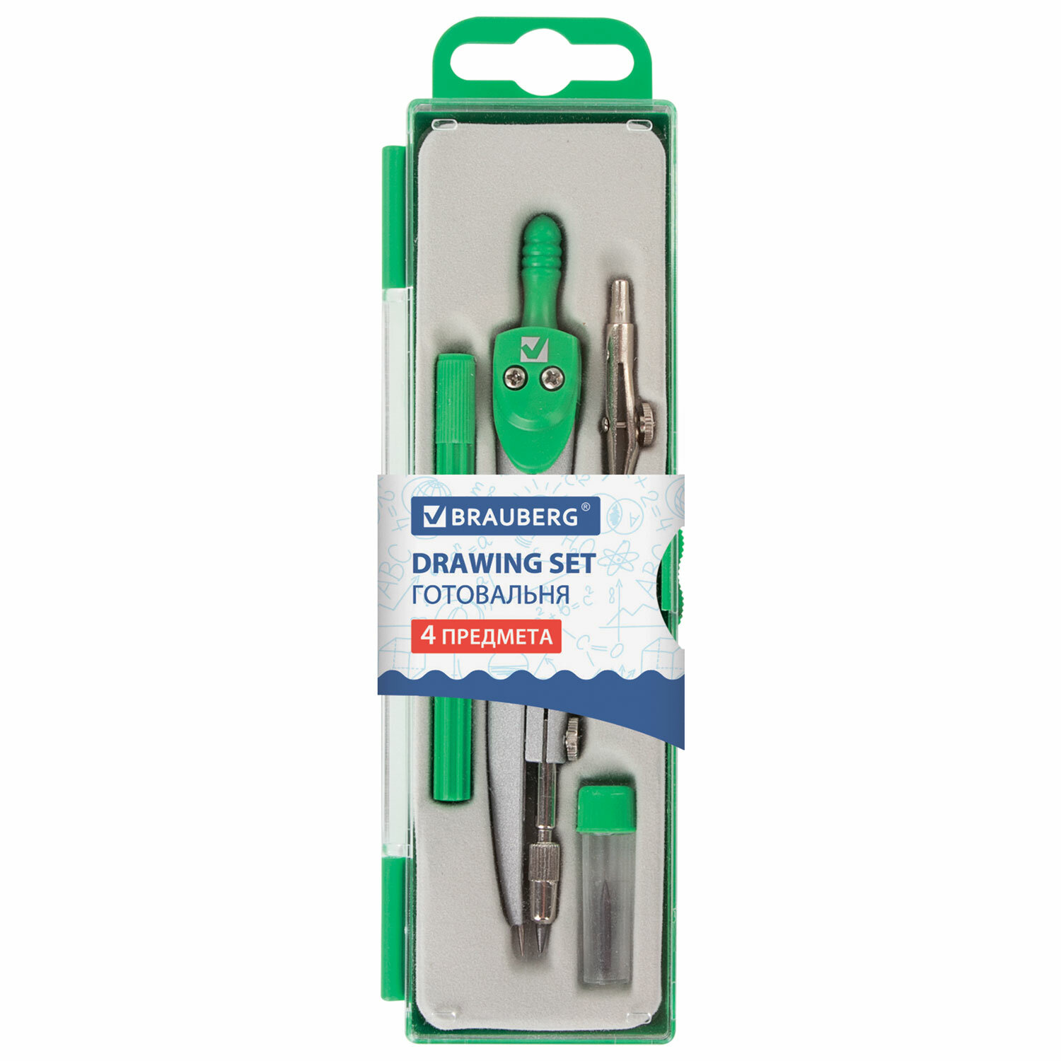 Готовальня BRAUBERG "Klasse", 4 предмета: циркуль 125 мм, рейсфедерная вставка + держатель, грифель Код товара: 210334 251,01 ₽ Купить Производитель:BRAUBERG Металлическая готовальня BRAUBERG "Klasse" предназначена для выполнения чертежных работ. Для учеников младших и средних классов. В состав готовальни входят 4 предмета: - циркуль; - рейсфедерная вставка; - держатель для рейсфедерной вставки; - пенал с запасным грифелем. Циркуль длиной 125 мм имеет несгибаемые штанги. Изготовлен из металла, дополнительный цвет элементов – зеленый. Поставляется в пластиковом пенале с европодвесом.Производство: КитайТип товара: готовальняСерия: KlasseКоличество предметов: 4 шт.Длина циркуля: 125 ммТип штанги: несгибаемыеКомплектация: пенал с запасным грифелем, рейсфедерная вставка и держатель, циркульЦвет корпуса: зеленый/серебристыйМатериал: металлУпаковка: пластиковый пенал с европодвесомВес: 58 грРазмер упаковки: 1.9 × 16.6 × 4.6 смОбъём: 0.0002 м3Промежуточная упаковка: 20 штТранспортная упаковка: 240 штШтрих-код: 4606224052403 Сертификат-1.jpg Сертификат-2.jpg Сертификат-3.jpg