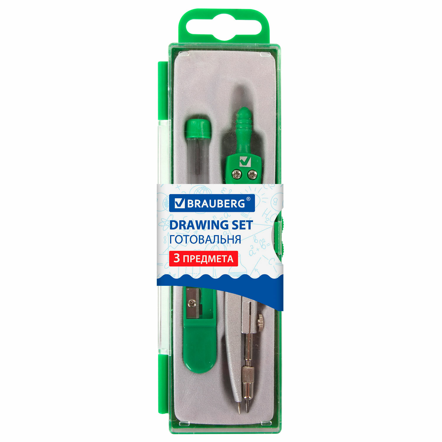 Готовальня BRAUBERG "Klasse", 3 предмета: циркуль 125 мм, точилка, грифель, пенал с подвесом Код товара: 210660 234,4 ₽ Купить Производитель:BRAUBERG Металлическая готовальня BRAUBERG "Klasse" предназначена для выполнения чертежных работ. Для учеников младших и средних классов. В состав готовальни входят 3 предмета: - циркуль; - точилка; - пенал с запасным грифелем. Циркуль длиной 125 мм имеет несгибаемые штанги. Изготовлен из металла, дополнительный цвет элементов – зеленый. Поставляется в пластиковом пенале с европодвесом.Производство: КитайТип товара: готовальняСерия: KlasseКоличество предметов: 3 шт.Длина циркуля: 125 ммТип штанги: несгибаемыеКомплектация: пенал с запасным грифелем, точилка, циркульЦвет корпуса: зеленый/серебристыйМатериал: металлУпаковка: пластиковый пенал с европодвесомВес: 56 грРазмер упаковки: 1.9 × 16.7 × 4.9 смОбъём: 0.0002 м3Промежуточная упаковка: 24 штТранспортная упаковка: 192 штШтрих-код: 4606224218113 Сертификат-1.jpg Сертификат-2.jpg Сертификат-3.jpg