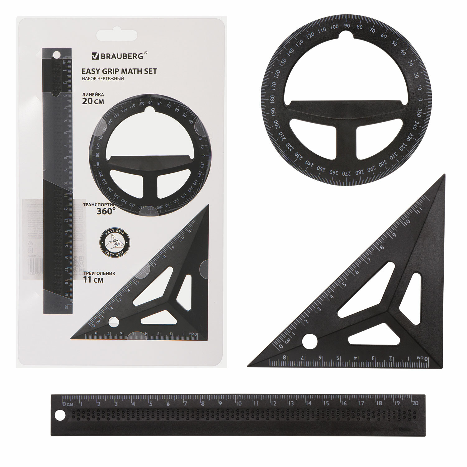 Набор чертежный BRAUBERG объёмный (линейка 20 см, угольник, транспортир), черный, подвес Код товара: 210746 226,06 ₽ Купить Производитель:BRAUBERG Чертежный объемный набор BRAUBERG предназначен для выполнения чертежных и измерительных работ. Изготовлен из пластика. Благодаря объемным деталям удобен в использовании. Цвет - черный. Поставляется в прозрачном пакете с пластиковой подложкой и европодвесом. В набор входят: - линейка со шкалой 20 см; - треугольник с углами 45° и шкалой 10 см; - транспортир 360°.Производство: КитайКоличество предметов в наборе: 3 шт.Максимальная длина разметки: 20 смКомплектация: линейка, малый треугольник, транспортирМатериал: пластикЦвет: черныйУпаковка: пакет с пластиковой подложкой и европодвесомВес: 61 грРазмер упаковки: 1.3 × 28.1 × 17.2 смОбъём: 0.0004 м3Промежуточная упаковка: 12 штТранспортная упаковка: 288 штШтрих-код: 4606224297804 Файлы Сертификат-1.jpg Сертификат-2.jpg Сертификат-3.jpg Сертификат-4.jpg