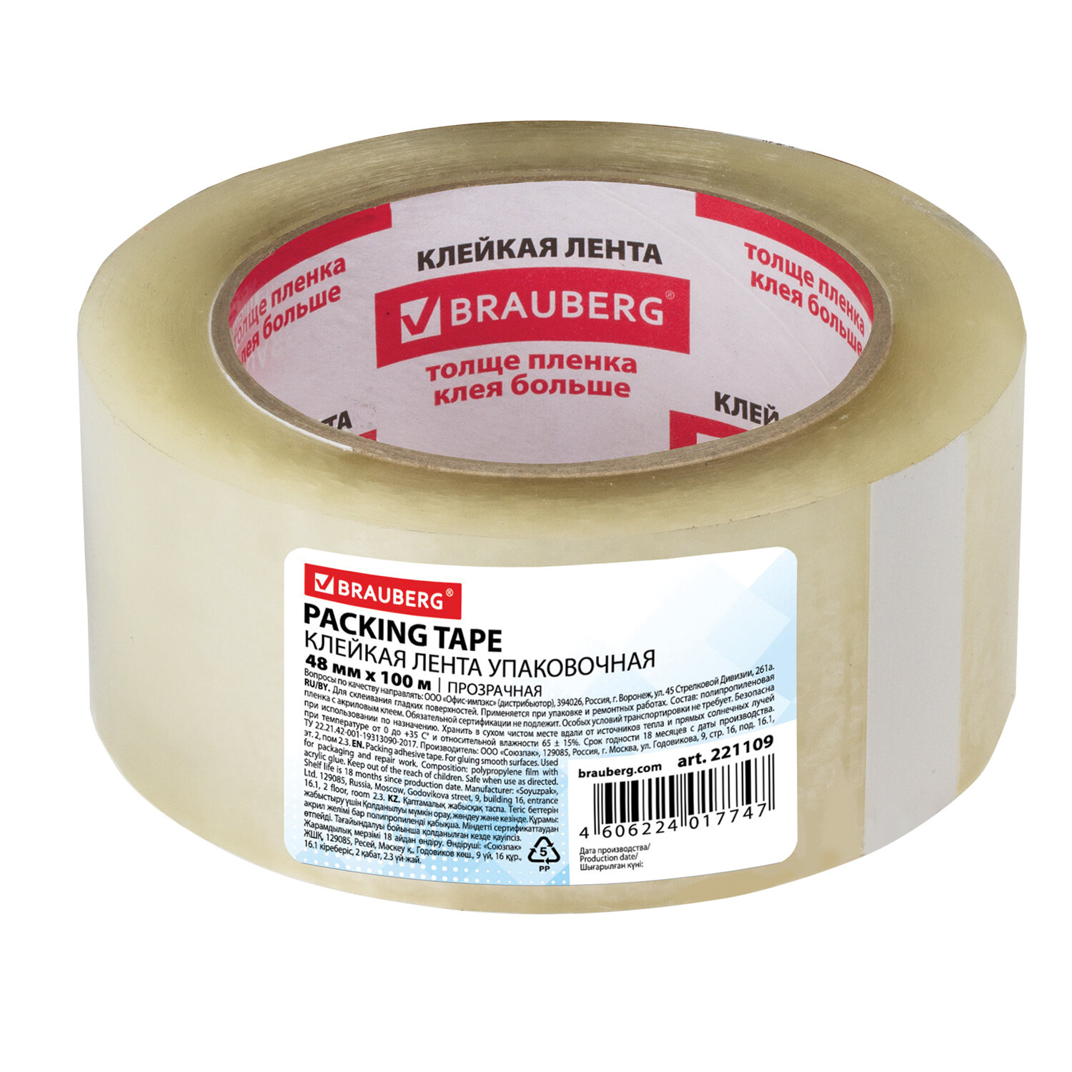 Клейкая лента упаковочная, 48 мм х 100 м, прозрачная, толщина 45 микрон, BRAUBERG Код товара: 221109 128,75 ₽ Купить Производитель:BRAUBERG Упаковочная клейкая лента BRAUBERG активно используется в торговле, промышленности, быту и подходит для оперативной упаковки с помощью диспенсера или вручную. Отличается высокой адгезией клея (слипанием с поверхностью) и стойкостью к разрыву. Толщина скотча 45 мкм позволяет переносить воздействие низких температур и влажности и выдерживать вес коробки 15-17 кг. Клейкой ленты шириной 48 мм и длиной намотки 100 м хватит на продолжительное время. Цвет - прозрачный. Обеспечить надёжную и качественную упаковку любых видов грузов сможет клейкая лента BRAUBERG.Производство: РоссияШирина: 48 ммДлина намотки: 100 мТолщина: 45 мкмКоличество в упаковке: 1 шт.Дополнительные свойства: суперклейкаяДиаметр втулки: 76.2 ммТип клейкой ленты: упаковочнаяЦвет: прозрачныйУпаковка: нетСрок годности: 18 месВес: 239 грРазмер упаковки: 4.8 × 11.4 × 11.4 смОбъём: 0.0009 м3Промежуточная упаковка: 36 штТранспортная упаковка: 36 штШтрих-код: 4606224017747 Файлы Сертификат-1.jpg Сертификат-2.jpg Сертификат-3.jpg Сертификат-4.jpg Сертификат-5.jpg Сертификат-6.jpg Сертификат-7.jpg Сертификат-8.jpg Сертификат-9.jpg Сертификат-10.jpg Сертификат-11.jpg Сертификат-12.jpg Сертификат-13.jpg Сертификат-14.jpg Сертификат-15.jpg Сертификат-16.jpg Сертификат-17.jpg Сертификат-18.jpg Сертификат-19.jpg Сертификат-20.jpg Сертификат-21.jpg Сертификат-22.jpg Сертификат-23.jpg Сертификат-24.jpg Сертификат-25.jpg Сертификат-26.jpg