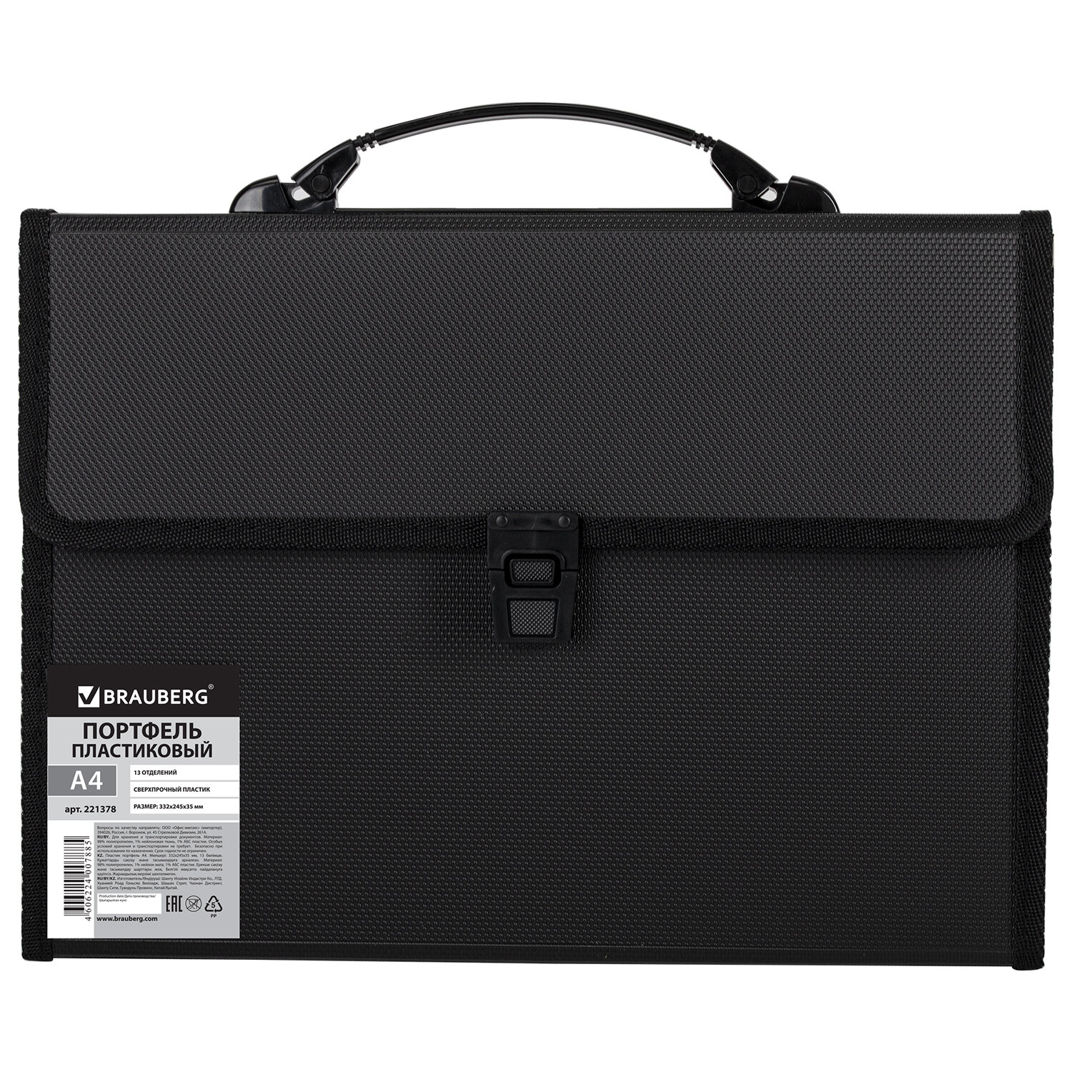 Папка-портфель пластиковая BRAUBERG А4 (332х245х35 мм), 13 отделений, черная Код товара: 221378 526,89 ₽ Купить Производитель:BRAUBERG Портфель BRAUBERG предназначен для транспортировки документов, бумаг и различных предметов и широко используется школьниками, студентами, офисными работниками и людьми творческих профессий. Портфель формата А4 (332х245х35 мм) изготовлен из плотного пластика толщиной 1 мм, выполнен в солидном черном цвете с фактурой "циновка" и имеет 13 отделений с индексными ярлыками. Складная ручка обеспечивает компактность изделия. Портфель застегивается на клапан. Края окантованы тканью с металлическими рейками по краям окантовки, что придает изделию презентабельный вид.Производство: КитайТип товара: портфельФормат: А4Количество отделений: 13Фактура: циновкаЗастежка: клапанСерия: Standard Тип ручки: складнаяТолщина материала: 1 ммИндексные ярлычки: даТканевая окантовка: даМеталлические рейки по краям окантовки: даВысота: 245 ммШирина: 332 ммГлубина: 35 ммМатериал: пластикЦвет: черныйВес: 461 грРазмер упаковки: 3.8 × 33.1 × 25.8 смОбъём: 0.004 м3Промежуточная упаковка: 10 штТранспортная упаковка: 40 штШтрих-код: 4606224007885 Сертификат-1.jpg Сертификат-2.jpg Сертификат-3.jpg