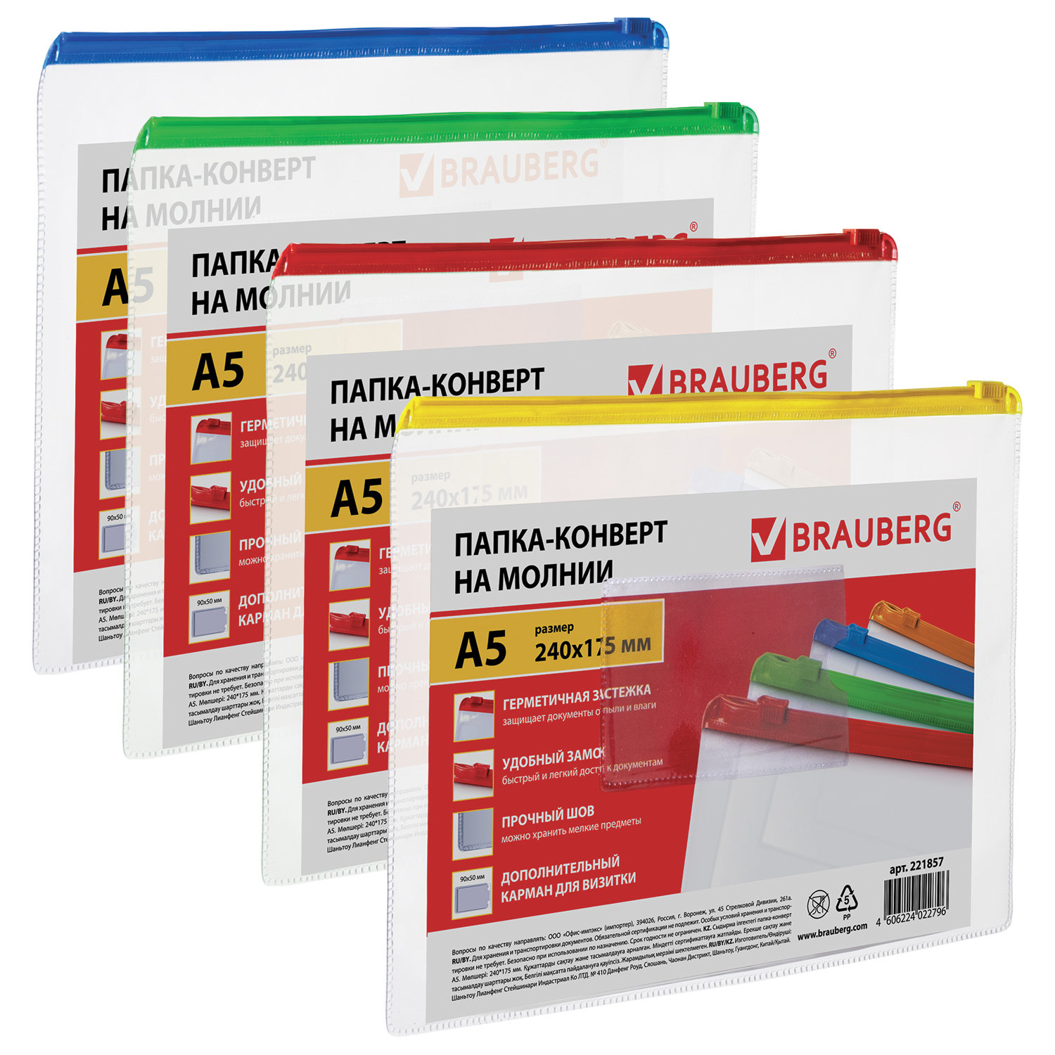 Папка-конверт на молнии МАЛОГО ФОРМАТА (240х175 мм), А5, молния ассорти, 0,15 мм, BRAUBERG "Smart" Код товара: 221857 43,46 ₽ Купить Производитель:BRAUBERG Папка-конверт на молнии BRAUBERG "Smart" идеально подойдет для хранения и транспортировки документов. Изготовлена из прочного прозрачного пластика толщиной 0,15 мм с гладкой фактурой. Формат А5 (240х175 мм). Герметичная застежка-зиплок защищает документы от механических повреждений, а также пыли и влаги. Имеется карман для визитки. Цвет молнии - ассорти (поставляется без возможности выбора).Производство: КитайФормат: A5Серия: SmartФактура: гладьКоличество отделений: 1 шт.Карман для визитки: даЗастежка: зиплокЦвет: прозрачныйЦвет молнии: ассортиВысота: 175 ммШирина: 240 ммТолщина пластика: 150 мкмМатериал: ПВХВес: 23 грРазмер упаковки: 0.2 × 23.8 × 18 смОбъём: 0.0001 м3Промежуточная упаковка: 12 штТранспортная упаковка: 600 штШтрих-код: 4606224022796 Файлы Сертификат-1.jpg Сертификат-2.jpg Сертификат-3.jpg Сертификат-4.jpg Сертификат-5.jpg Сертификат-6.jpg Сертификат-7.jpg Сертификат-8.jpg Сертификат-9.jpg Сертификат-10.jpg Сертификат-11.jpg Сертификат-12.jpg Сертификат-13.jpg Сертификат-14.jpg Сертификат-15.jpg Сертификат-16.jpg Сертификат-17.jpg Сертификат-18.jpg Сертификат-19.jpg Сертификат-20.jpg Сертификат-21.jpg Сертификат-22.jpg Сертификат-23.jpg Сертификат-24.jpg Сертификат-25.jpg Сертификат-26.jpg