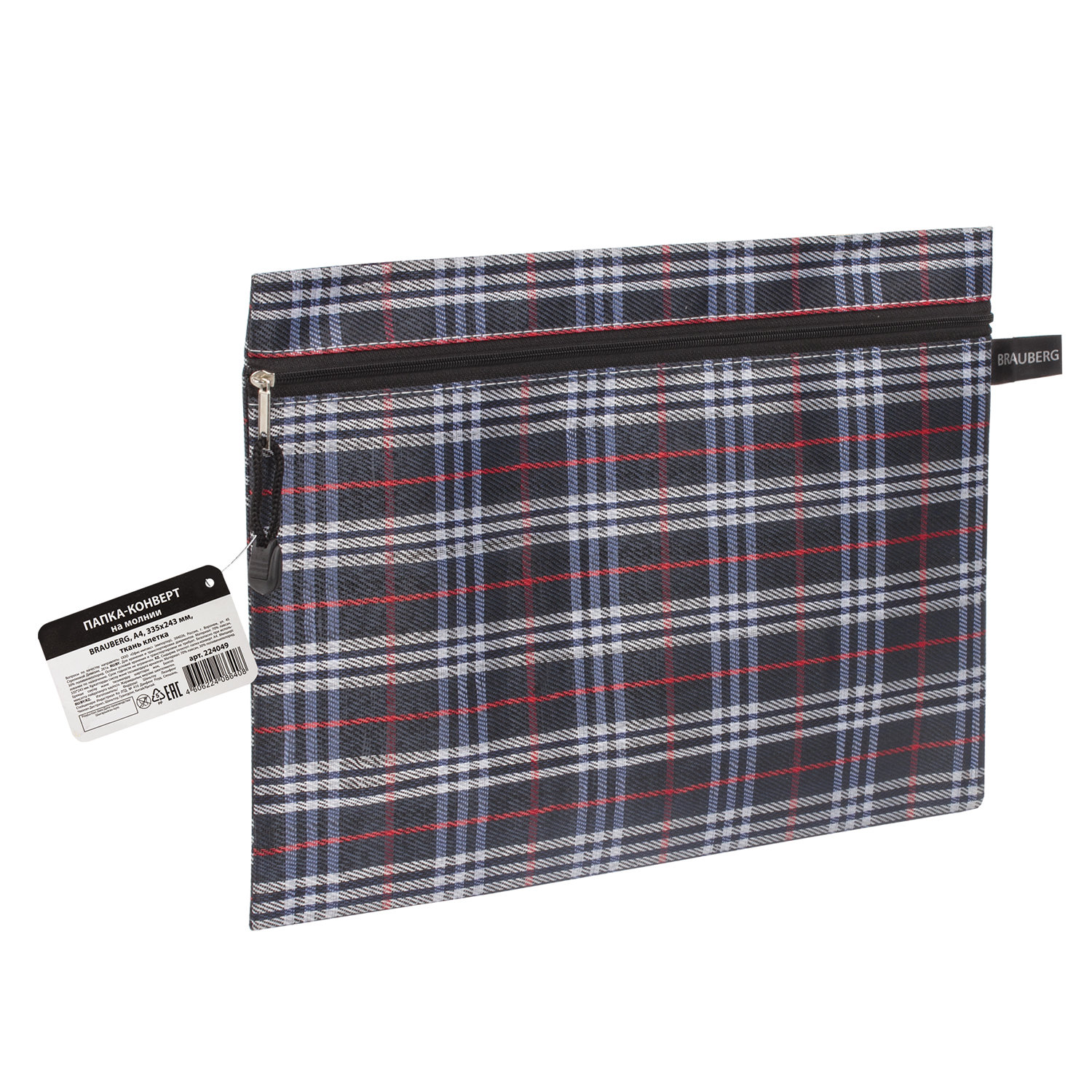 Папка-конверт на молнии А4 (335х243 мм), ткань в клетку, BRAUBERG "Elegant" Ликвидация Код товара: 224049 121,76 ₽ Купить Производитель:BRAUBERG Папка-конверт на молнии BRAUBERG "Elegant" идеально подойдет для хранения и транспортировки документов. Изготовлена из прочного стильного текстильного материала в клетку. Формат А4 (335х243 мм). Герметичная застежка-молния защищает документы от механических повреждений, а также пыли и влаги. Цвет молнии - черный.Производство: КитайФормат: A4Серия: ElegantФактура: гладьКоличество отделений: 1 шт.Застежка: молнияЦвет: черный/серыйЦвет молнии: чёрныйВысота: 243 ммШирина: 335 ммМатериал: текстильВес: 67 грРазмер упаковки: 0.5 × 32.5 × 24.3 смОбъём: 0.0002 м3Промежуточная упаковка: 12 штТранспортная упаковка: 480 штШтрих-код: 4606224086408 Сертификат-1.jpg Сертификат-2.jpg