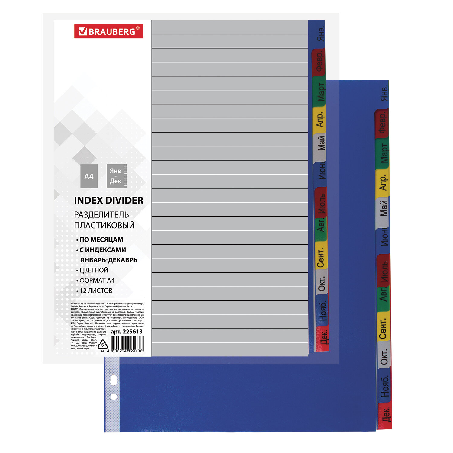 Разделитель пластиковый BRAUBERG, А4, 12 листов, Январь-Декабрь, оглавление, цветной, РОССИЯ Код товара: 225613 327,83 ₽ Купить Производитель:BRAUBERG Пластиковые разделители BRAUBERG предназначены для систематизации документов внутри папок формата А4. Изготовлены из пластика толщиной 0,12 мм. В комплект входят 12 листов синего, красного, серого, зеленого и желтого цвета, обеспечивающих возможность сортировки документов по месяцам, а также титульный лист для оглавления. Универсальная перфорация позволяет подшивать разделители во все типы папок. Размер - 224х297 мм.Производство: РоссияТип сортировки: по месяцамДля папок формата: А4Титульный лист для оглавления: даКоличество в упаковке: 12 шт.Форма: стандартный листМатериал: пластикСерия: Standard Толщина пластика: 0.12 ммУниверсальная перфорация для всех типов папок: даНаличие индексации: даШирина: 224 ммДлина: 297 ммЦвет: ассортиВес: 106 грРазмер упаковки: 0.2 × 30.1 × 22.8 смОбъём: 0.0002 м3Промежуточная упаковка: 25 штТранспортная упаковка: 150 штШтрих-код: 4606224129136 Файлы Сертификат-1.jpg Сертификат-2.jpg Сертификат-3.jpg Сертификат-4.jpg Сертификат-5.jpg Сертификат-6.jpg Сертификат-7.jpg Сертификат-8.jpg Сертификат-9.jpg Сертификат-10.jpg Сертификат-11.jpg Сертификат-12.jpg Сертификат-13.jpg Сертификат-14.jpg Сертификат-15.jpg Сертификат-16.jpg Сертификат-17.jpg Сертификат-18.jpg Сертификат-19.jpg Сертификат-20.jpg Сертификат-21.jpg Сертификат-22.jpg Сертификат-23.jpg Сертификат-24.jpg Сертификат-25.jpg Сертификат-26.jpg