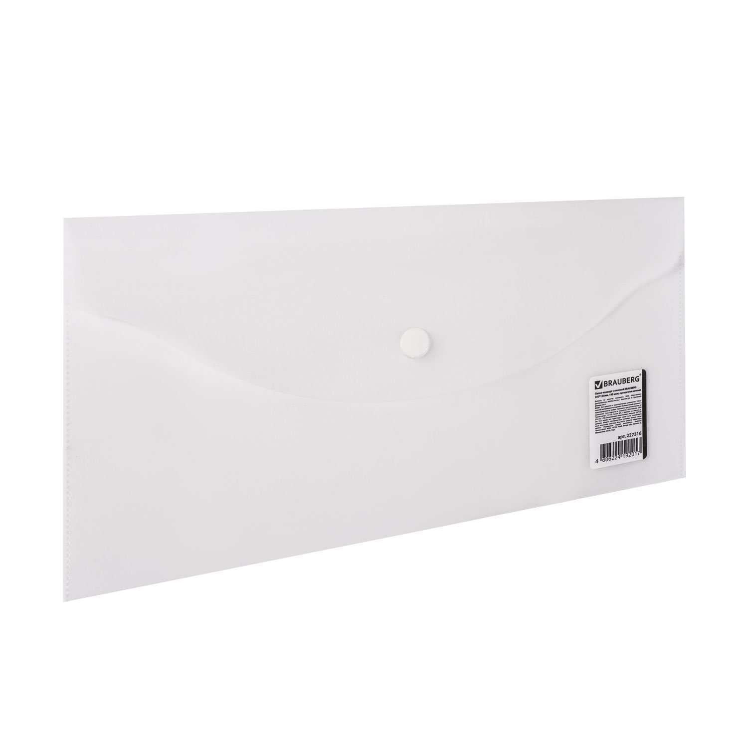 Папка-конверт с кнопкой МАЛОГО ФОРМАТА (250х135 мм), матовая прозрачная, 0,18 мм, BRAUBERG Код товара: 227316 56,02 ₽ Купить Производитель:BRAUBERG Папка с кнопкой BRAUBERG - универсальная модель для хранения, транспортировки и защиты документов и мелких предметов от негативных внешних факторов. Станет незаменимым помощником для школьников, студентов, офисных работников и творческих людей. Папка-конверт с гладкой фактурой размера 250х135 мм изготовлена из плотного матового полупрозрачного пластика толщиной 180 мкм. Закрывается на защелку-кнопку, что делает удобным частое использование и обеспечивает быстрый доступ к ее содержимому. Папка способна вместить до 100 листов стандартной плотности.Производство: РоссияФормат: 250х135 ммОриентация: горизонтальнаяВмещает до: 100 листовФактура: гладкаяТип спецэффектов: матовыйТип пластика: прозрачныйСерия: Small-sizeДизайн: прозрачныйКоличество в комплекте: 1 шт.Толщина пластика: 180 мкмТип замка: кнопкаЦвет: прозрачныйВысота: 135 ммШирина: 250 ммГлубина: 0.36 ммМатериал: полипропиленВес: 14 грРазмер упаковки: 0.4 × 24.9 × 13.5 смОбъём: 0.0002 м3Промежуточная упаковка: 10 штТранспортная упаковка: 100 штШтрих-код: 4606224192017 Файлы Сертификат-1.jpg Сертификат-2.jpg Сертификат-3.jpg Сертификат-4.jpg