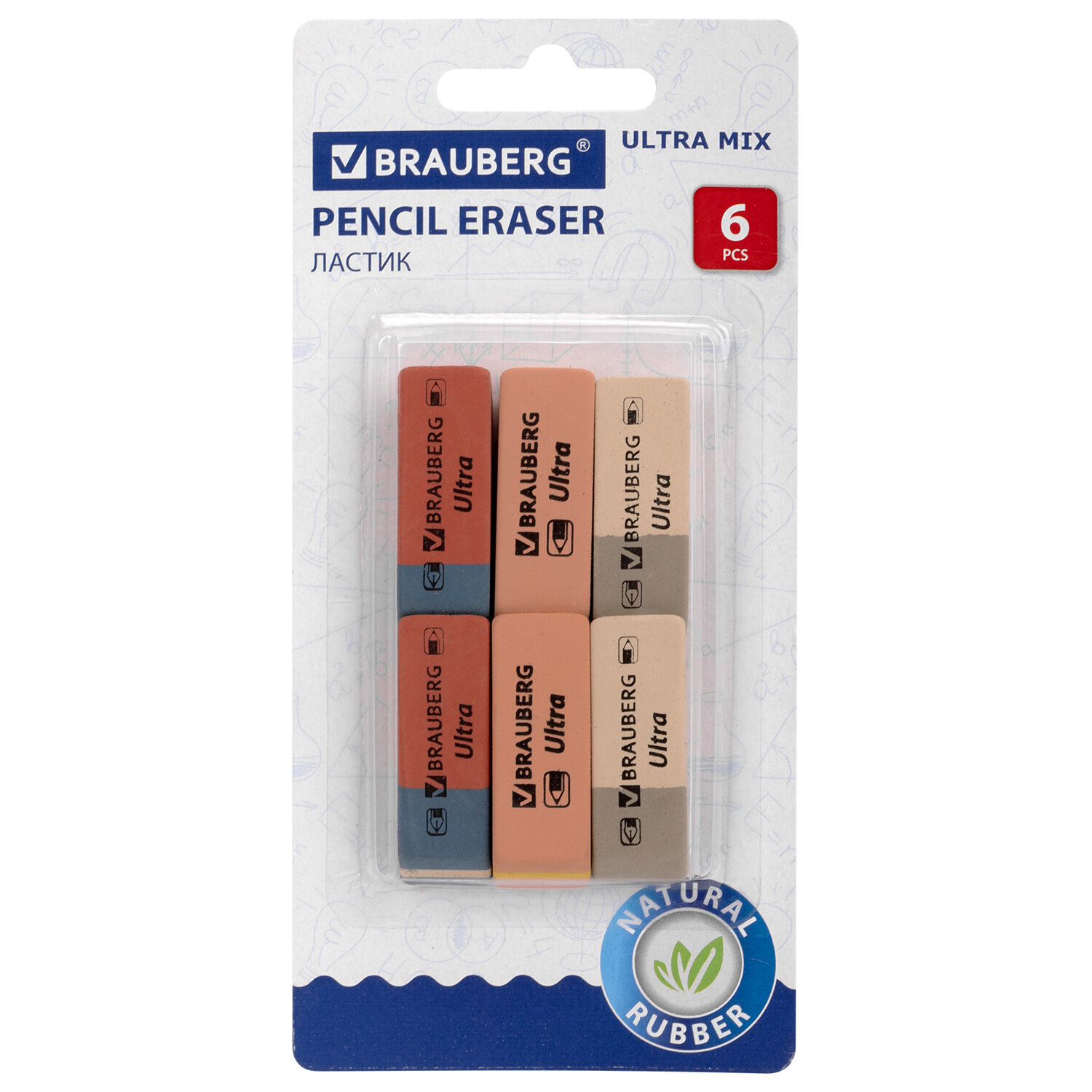 Ластики BRAUBERG "Ultra Mix" 6 шт., размер ластика 41х14х8 мм, ассорти, натуральный каучук Код товара: 229602 153,45 ₽ Купить Производитель:BRAUBERG Ластики BRAUBERG "Ultra" предназначены для удаления надписей, сделанных чернографитным карандашом или чернилами. Набор из шести высококачественных ластиков, изготовленных из натурального каучука. Поставляются в цветах ассорти и имеют прямоугольную форму со скошенными краями, позволяющими стирать даже тонкие линии. Размер - 41х14х8 мм. Упаковка - блистер с подвесом.Производство: МалайзияКоличество в упаковке: 6 шт.Материал: натуральный каучукФорма: прямоугольнаяСтираемые письменные принадлежности: чернила, чернографитные карандашиЦвет: ассортиСерия: UltraНе оставляет бумажной пыли: даРазмер: 41х14х8 ммИндивидуальная упаковка: даУпаковка: блистерВес: 57 грРазмер упаковки: 0.9 × 15.6 × 7.1 смОбъём: 0.0002 м3Промежуточная упаковка: 10 штТранспортная упаковка: 200 штШтрих-код: 4606224280752 Сертификат-1.jpg Сертификат-2.jpg