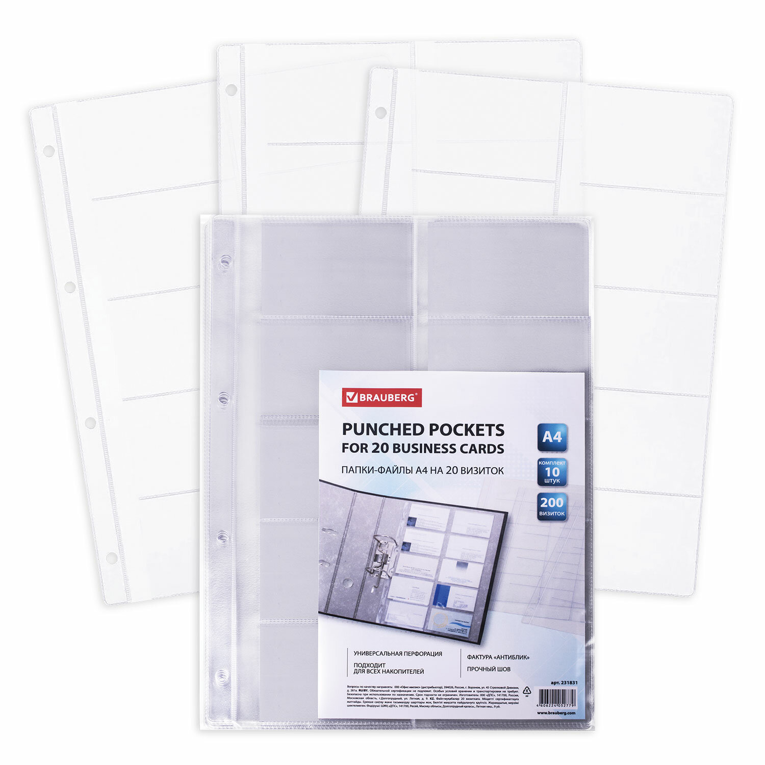 Папки-файлы на 20 визиток BRAUBERG, КОМПЛЕКТ 10 шт., А4 (210х297 мм), перфорированные, ПВХ 120 мкм Код товара: 231831 436,59 ₽ Купить Производитель:BRAUBERG Папки-файлы BRAUBERG предназначены для хранения визитных карточек. Перфопапки формата А4 изготовлены из прочного ПВХ плотностью 120 мкм. Имеют антибликовую фактуру. Специальная перфорация позволяет использовать файл для подшивки в папки с механизмом архивации на 2 или 4 кольцах, а также в скоросшиватель. Прочные швы карманов увеличивают срок службы изделия. 10 карманов рассчитаны на 20 визиток (в один кармашек можно вложить 2 визитки). Размер кармашков – 85х56 мм. В комплекте 10 листов.Производство: РоссияФормат А4.На 20 визитных карточек.Размеры кармашков для визиток 85х56 мм.Плотность ПВХ - 120 мкм.Антибликовая фактура.10 штук в комплекте.Вес: 210 грРазмер упаковки: 0.3 × 30.4 × 21.9 смОбъём: 0.0005 м3Промежуточная упаковка: 50 штТранспортная упаковка: 50 штШтрих-код: 4606224052779 Сертификат-1.jpg Сертификат-2.jpg Сертификат-3.jpg