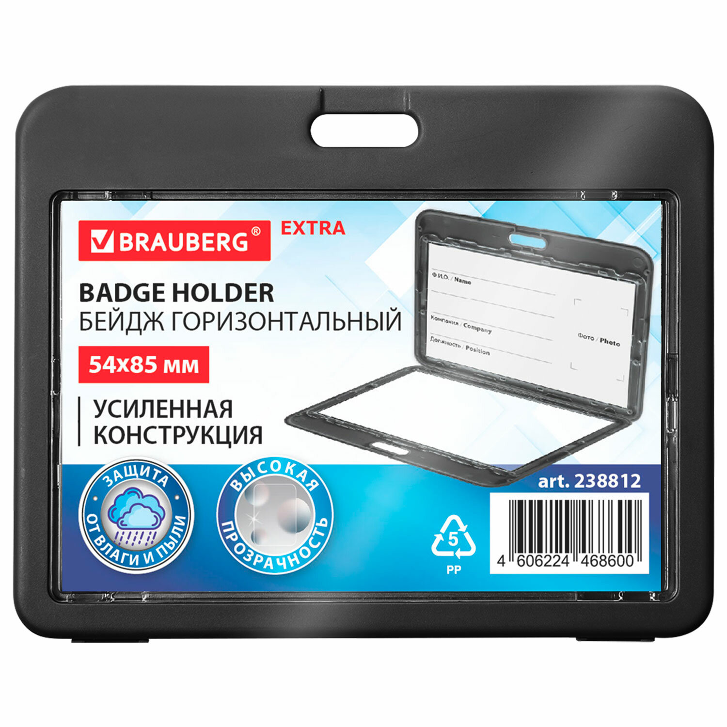 Бейдж горизонтальный (54х85 мм), ДВУСТОРОННИЙ,черный, ЗАЩИТА ОТ ВЛАГИ И ПЫЛИ, BRAUBERG EXTRA Код товара: 238812 83,9 ₽ Купить Производитель:BRAUBERG Горизонтальный бейдж BRAUBERG для хранения пропусков и карточек сотрудников, ID карт, проездных и банковских карт. Бейдж подходит для крепления на ленте, держателе с рулеткой. Изготовлен из жесткого пластика, гарантирующего его долгий срок службы. Защищает от влаги и пыли Вашу карту. Идеально подойдёт для чувствительных к механическим повреждениям магнитных карт и пропусков. Прозрачное окно с обеих сторон бейджа. Размер вкладыша 54х85 мм. *Вкладыш бейджа без персонализации, на изображении показан возможный пример использования изделия.Производство: КитайТип бейджа: для проездных, пропусков, картПоложение: горизонтальноеКоличество в комплекте: 1 шт.Размер вкладыша (ДхШ): 54х85 ммРазмер бейджа (ДхШ): 77х99 ммСерия: EXTRAЦвет крепления: нетМатериал корпуса: твердый пластикЦвет корпуса: черныйНаличие картонной вставки: даВес: 30 грРазмер упаковки: 0.6 × 10 × 7.7 смОбъём: 0.0001 м3Промежуточная упаковка: 10 штТранспортная упаковка: 400 штШтрих-код: 4606224468600