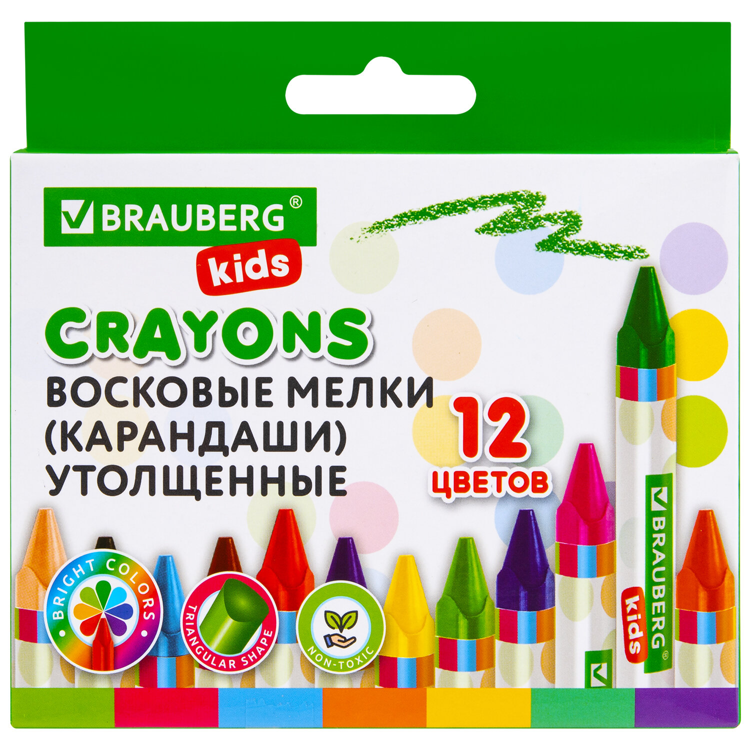Восковые мелки трехгранные утолщенные BRAUBERG KIDS, НАБОР 12 цветов Код товара: 271695 91,11 ₽ Купить Производитель:BRAUBERG KIDS Восковые мелки BRAUBERG KIDS идеально подходят для детского творчества. Предназначены для рисования на бумаге любого типа, а также дереве, картоне и стекле. Палитра состоит из 12 ярких и насыщенных цветов. Полностью безопасны в использовании, не токсичны и не имеют резкого запаха. Благодаря своему составу мелки пишут мягко, и ребенку не придется прикладывать усилия в процессе рисования. Утолщенная трехгранная форма корпуса и диаметр 11 мм делают их их подходящим инструментом для подготовки руки дошкольников и детей младшего школьного возраста к письму: формируют навык правильного захвата, снижают нагрузку на кисть. Каждый мелок обернут в бумажную гильзу, которая предотвращает скольжение пальцев и позволяет не пачкать руки. Восковые мелки упакованы в картонную коробку с европодвесом.Производство: КитайТип основы: восковая основаКоличество цветов в наборе: 12 шт.Форма корпуса: трехграннаяДиаметр: 11 мм Утолщенный корпус: даСерия: KidsБумажное покрытие корпуса: даУпаковка: картонная с европодвесомВес: 141 грРазмер упаковки: 1.3 × 13 × 11.5 смОбъём: 0.0003 м3Промежуточная упаковка: 12 штТранспортная упаковка: 144 штШтрих-код: 4606224391328 Сертификат-1.jpg Сертификат-2.jpg Сертификат-3.jpg
