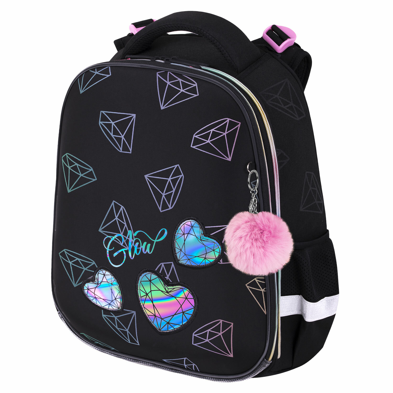 Ранец BRAUBERG LUMINOUS, 2 отделения, с брелоком, "Diamonds", СВЕТЯЩИЙСЯ РИСУНОК, 38х29х16 см Код товара: 272070 4 902,22 ₽ Купить Производитель:BRAUBERG Ранец BRAUBERG серии LUMINOUS изготовлен из легкого, формоустойчивого, экологичного материала EVA с применением технологии радужного светоотражающего принта. Передняя панель украшена оригинальными аппликациями. В комплекте с ранцем идёт брелок-подвеска. Ранцы BRAUBERG LUMINOUS протестированы НИИ гигиены и охраны здоровья детей и подростков ФГАУ "Национальный медицинский исследовательский центр здоровья детей". В рамках проведенных исследований* было установлено, что конструкции и материалы ученических ранцев соответствуют современным эргономическим требованиям и способствуют формированию здоровой осанки у школьников. Дизайн передней панели ранца реализован с использованием уникального светоотражающего принта: при попадании искусственного света ранец переливается разноцветным свечением, тем самым привлекая внимание и повышая безопасность ребенка в темное время суток. Голографическая аппликация на передней панели и пушистый брелок дополняют дизайн ранца. Ранец BRAUBERG LUMINOUS сочетает в себе лучшие качества: безопасность, эргономичность, современные технологии. Каждая деталь ранца продумана до мелочей. Ранец покрыт высококачественной влагоотталкивающей нейлоновой тканью – кордура, в которой за счёт особой структуры нити достигнута четырёхкратная стойкость к истиранию по сравнению с простым нейлоном. Также эта ткань легко чистится! Регулируемые по длине и высоте лямки можно оптимально подогнать под комплекцию ребенка, чтобы ранец носился с комфортом, несмотря на зачастую избыточный вес содержимого: учебников, тетрадей, канцтоваров. Регулировка позволит использовать ранец не один год! Съёмные нагрудные ремешки помогают равномерно распределять нагрузку на спину. Удобная мягкая вентилируемая спинка с воздушными спонжевыми панелями разработана с учетом анатомических особенностей детей младшего школьного возраста. При правильной регулировке ранец будет практически не ощущаться на плечах и не будет доставлять дискомфорт при носке. В процессе эксплуатации равномерное распределение нагрузки позволит сохранить правильную осанку! В основном отделении ранца можно легко и быстро разместить учебники. Внутри фронтального отделения находится органайзер для канцтоваров, именная карточка, карман для телефона и большое отделение из сетки. Такая организация пространства поможет держать принадлежности в сохранности и приучить ребенка к порядку. Ранец широко раскрывается, повышая удобство использования, а за счёт боковых перегородок содержимое не выскользнет из ранца. Ранец легко открывать и закрывать одной рукой с любой стороны – каждое отделение имеет долговечную реверсивную молнию с двумя металлическими бегунками. Нести ранец будет удобно не только на плечах, но и в руке за прочную уплотненную ручку. Также имеется специальная петелька из плетеной нейлоновой нити, чтобы вешать ранец на крючок парты. Модель имеет боковые карманы на резинке, в которых можно разместить бутылочку, термос или зонт. Светоотражающие элементы ранца расположены спереди, на торцах и на лямках. Они необходимы для безопасности ребенка в темное время суток. Декоративный брелок-подвеска в подарок. Яркая этикетка расположена на п