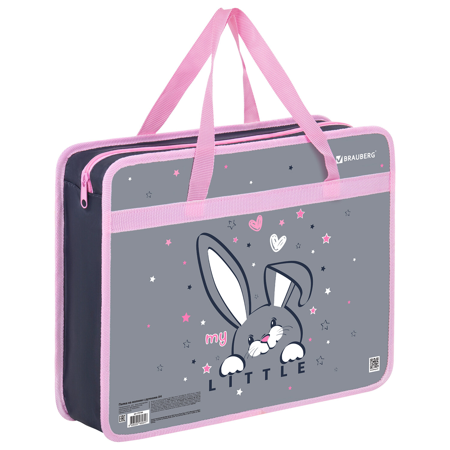 Папка на молнии с ручками BRAUBERG А4, 1 отделение, пластик, 80 мм, "Curious bunny" Код товара: 272164 311,66 ₽ Купить Производитель:BRAUBERG Папка на молнии с ручками BRAUBERG А4 "Curious bunny" предназначена для транспортировки и хранения канцелярских принадлежностей и учебных пособий. Папка защитит содержимое от замятий и повреждений. Идеально подходит для внешкольных занятий. Папка-сумка с ручками подходит для бумаг, документов и учебных пособий формата А4. Изготовлена из прочного износостойкого пластика с тканевой окантовкой по краям. Размер папки – 330х260 мм, ширина – 80 мм. Широкий формат товара позволяет разместить большое количество канцелярских принадлежностей для творчества внутри, в том числе стакан-непроливайку. Папка имеет удобную застежку-молнию сверху. Прочные ручки с надежным креплением к папке, изготовленные из тесьмы, способствуют комфортной переноске при большой нагрузке. Индивидуальная упаковка (полиэтиленовый пакет с европодвесом) сохраняет товар при транспортировке и позволяет удобно разместить его для клиента.Производство: РоссияТип товара: папка-сумкаСерия: DREAMФормат: А4Пол ребенка: для девочекКоличество отделений: 1Дизайн: Curious bunnyЗастежка: молнияРучки: тесьмаТолщина пластика: 0.5 ммТканевая окантовка: даЦветная печать: даМатериал: пластикДлина: 330 ммШирина: 260 ммГлубина: 80 ммЦвет: серебристый/розовыйВес: 161 грРазмер упаковки: 1.3 × 33.4 × 30.5 смОбъём: 0.0009 м3Промежуточная упаковка: 30 штТранспортная упаковка: 30 штШтрих-код: 4606224430317 Файлы Сертификат-1.jpg Сертификат-2.jpg Сертификат-3.jpg Сертификат-4.jpg