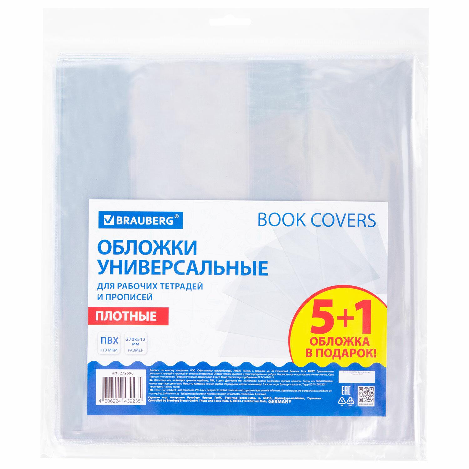 Обложки ПВХ для рабочих тетрадей и прописей, НАБОР "5 шт. + 1 шт. в ПОДАРОК", ПЛОТНЫЕ, 110 мкм, 270х512 мм, универсальные, BRAUBERG Код товара: 272696 125,39 ₽ Купить Производитель:BRAUBERG Прозрачные обложки BRAUBERG предохраняют рабочие тетради и прописи от внешних воздействий, увеличивая срок их службы и сохраняя прекрасный внешний вид. Изготовлены из высококачественного поливинилхлорида (ПВХ) толщиной 110 мкм. Предназначены для рабочих тетрадей и прописей. Размер – 270х512 мм. Универсальные глянцевые обложки легко регулируются под размер рабочих тетрадей и прописей. Не содержат веществ, вредных для здоровья детей.Производство: РоссияПредназначены для: прописей, рабочих тетрадейРазмер: 270х512 ммКоличество в комплекте: 6 шт.Регулировка ширины: даМатериал: ПВХТолщина: 110 мкмТип обложки: глянцеваяЦвет: прозрачныйВес: 153 грРазмер упаковки: 0.7 × 28.5 × 25.8 смОбъём: 0.0003 м3Промежуточная упаковка: 100 штТранспортная упаковка: 100 штШтрих-код: 4606224439235 Сертификат-1.jpg Сертификат-2.jpg Сертификат-3.jpg