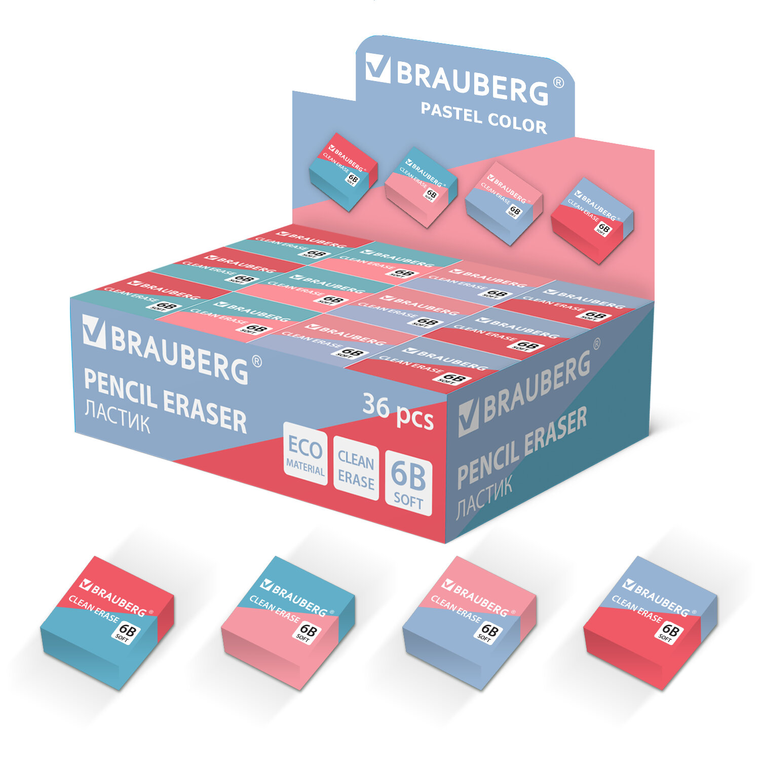 Ластик BRAUBERG "PASTEL COLOR DUO", 34х34х14 мм, квадратный, экологичный ПВХ, ассорти Код товара: 272733 20,93 ₽ Купить Производитель:BRAUBERG Ластик BRAUBERG "PASTEL COLOR DUO" предназначен для удаления надписей, сделанных чернографитным карандашом. Ластик BRAUBERG "PASTEL COLOR DUO" имеет удобную квадратную форму, позволяющую стирать как мелкие, так и крупные штрихи. Представлен в пастельных цветах, в четырех вариантах дизайна (без возможности выбора цвета). Ластик выполнен из экологичного ПВХ, обеспечивающего чистое стирание и минимум бумажной пыли. Размер одного ластика – 34х34х14 мм. Упакован в прозрачный рукав.Производство: КитайКоличество в упаковке: 1 шт.Материал: ECO-PVCФорма: квадратнаяСтираемые письменные принадлежности: чернографитные карандашиЦвет: пастельный ассортиСерия: Pastel Color DuoНе оставляет бумажной пыли: даРазмер: 34х34х14 ммИндивидуальная упаковка: даУпаковка: дисплейВес: 21 грРазмер упаковки: 1.4 × 3.4 × 3.4 смПромежуточная упаковка: 36 штТранспортная упаковка: 720 штШтрих-код: 4606224441504 Сертификат-1.jpg Сертификат-2.jpg Сертификат-3.jpg