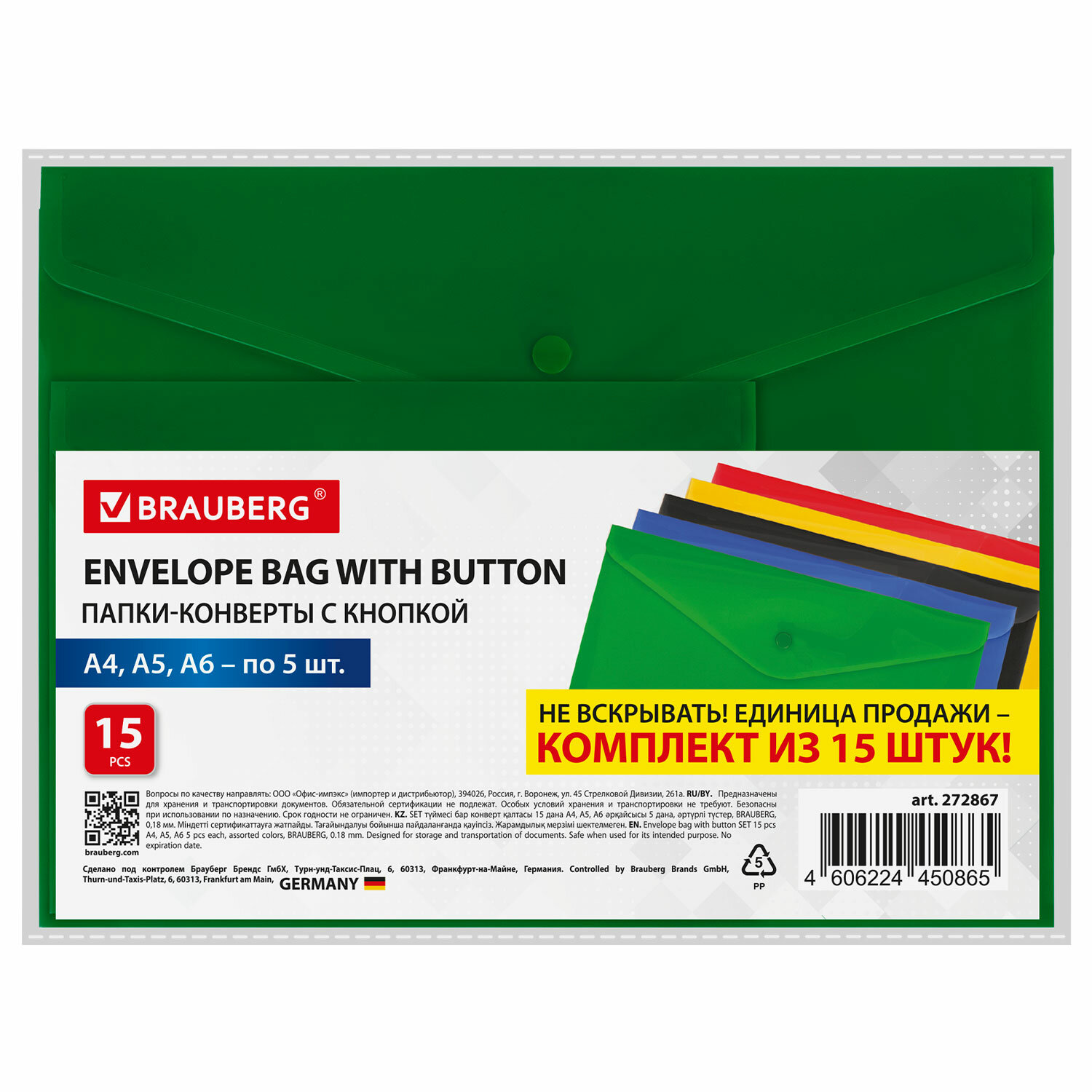 Папка-конверт с кнопкой КОМПЛЕКТ 15 шт., А4, А5, А6 по 5 шт., цвета ассорти, BRAUBERG, 0,18 мм, 272867 Код товара: 272867 405,6 ₽ Купить Производитель:BRAUBERG Папка с кнопкой BRAUBERG – универсальная модель для хранения, транспортировки и защиты документов и мелких предметов от негативных внешних факторов. Станет незаменимым помощником для школьников, студентов, офисных работников и творческих людей. Папки-конверты с гладкой фактурой формата А4 (330х235 мм), А5 (240х180 мм) и А6 (155х115 мм) изготовлены из плотного непрозрачного пластика. Цвета – ассорти, толщина – 180 мкм. Закрываются на защелку-кнопку, что делает удобным частое использование и обеспечивает быстрый доступ к содержимому. Папка способна вместить от 50 до 100 листов стандартной плотности (зависит от формата папки).Производство: КитайФормат: А4, A5, A6Ориентация: горизонтальнаяВмещает до: 100 листовФактура: гладкаяТип пластика: непрозрачныйСерия: SetДизайн: ассортиКоличество в комплекте: 15 шт.Толщина пластика: 180 мкмТип замка: кнопкаЦвет: ассортиВысота: 330 ммШирина: 235 ммГлубина: 0.36 ммМатериал: полипропиленВес: 272 грРазмер упаковки: 2.2 × 33.4 × 23.7 смОбъём: 0.0017 м3Промежуточная упаковка: 24 штТранспортная упаковка: 24 штШтрих-код: 4606224450865 Файлы Сертификат-1.jpg Сертификат-2.jpg Сертификат-3.jpg Сертификат-4.jpg Сертификат-5.jpg Сертификат-6.jpg Сертификат-7.jpg Сертификат-8.jpg Сертификат-9.jpg Сертификат-10.jpg Сертификат-11.jpg Сертификат-12.jpg Сертификат-13.jpg Сертификат-14.jpg Сертификат-15.jpg Сертификат-16.jpg Сертификат-17.jpg Сертификат-18.jpg Сертификат-19.jpg Сертификат-20.jpg Сертификат-21.jpg Сертификат-22.jpg Сертификат-23.jpg Сертификат-24.jpg Сертификат-25.jpg Сертификат-26.jpg