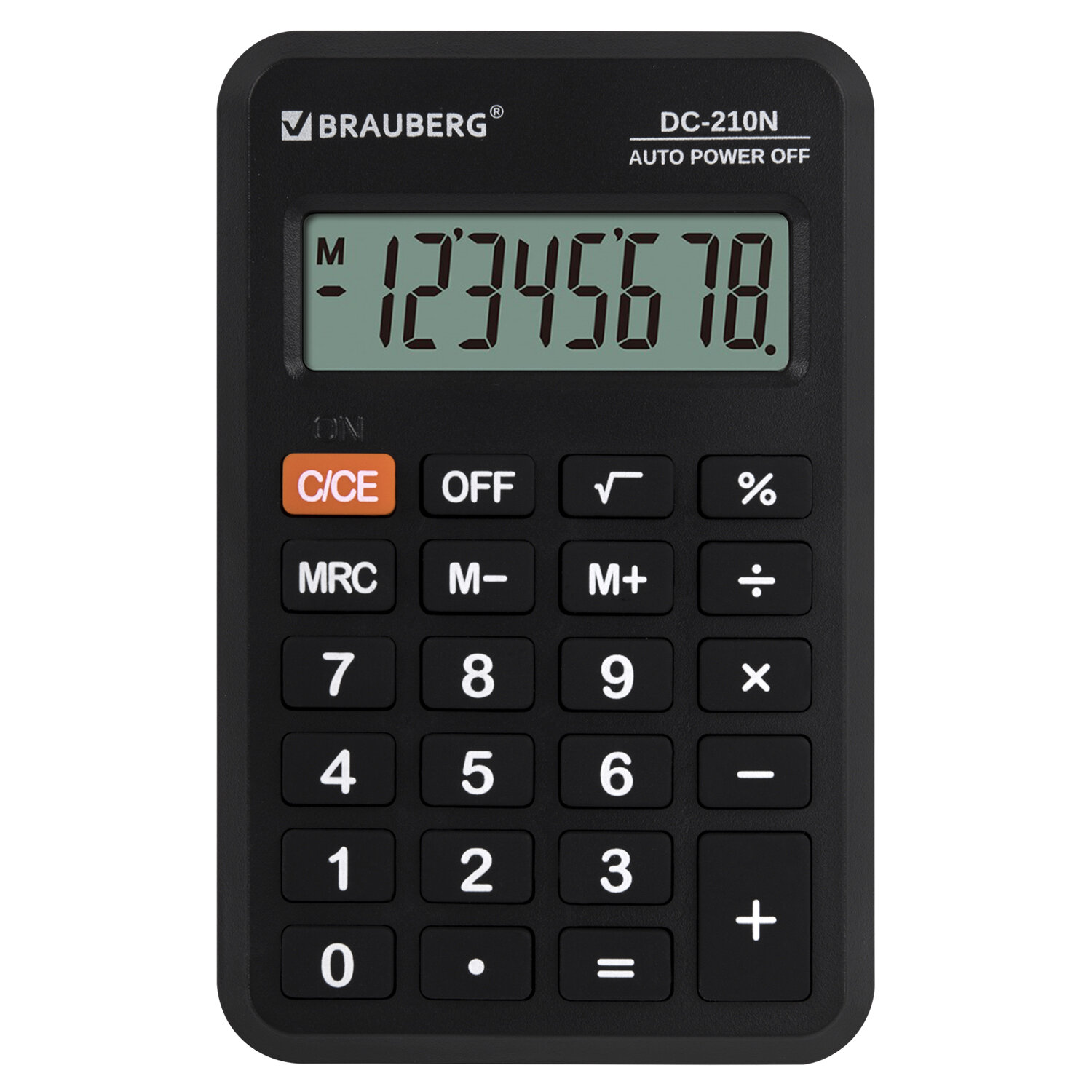 Калькулятор карманный BRAUBERG DC-210N (63х98 мм), 8 разрядов, черный, 272953 Код товара: 272953 283,55 ₽ Купить Производитель:BRAUBERG Карманный калькулятор BRAUBERG DC-210N — простой и надежный инструмент для повседневных расчетов. Легкий и компактный, он пригодится в офисе, школе или дома. Калькулятор выполняет все основные арифметические действия, операции с памятью и процентами, а также извлечение квадратного корня. Вводимые данные и результаты вычислений хорошо видны на контрастном дисплее. Встроенный аккумулятор рассчитан на многолетнюю работу и оснащён функцией автоматического отключения (через 8–10 минут бездействия) и кнопкой "OFF" – это снижает расход энергии и увеличивает срок службы без замены батареи. Размер – 98х63 мм. Гарантия – 10 лет.Производство: КитайРазрядность дисплея: 8Серия: DC-210NТип питания: 1 батарейка LR54 (LR1130/AG10)Конструктивные особенности: нетЦвет панели: черныйИсполнение: карманныйМатериал клавиш: резинаДлина корпуса: 98 ммШирина корпуса: 63 ммТолщина корпуса: 12 ммВес: 34 гФункционал: вычисление с памятью, извлечение квадратного корня, расчет процентов, сложение, вычитание, деление, умножениеУпаковка: картонная коробка с европодвесомРазмер упаковки: 1.8 × 11.8 × 6.6 смОбъём: 0.0002 м3Промежуточная упаковка: 40 штТранспортная упаковка: 160 штШтрих-код: 4606224453002 Сертификат-1.jpg Сертификат-2.jpg Сертификат-3.jpg