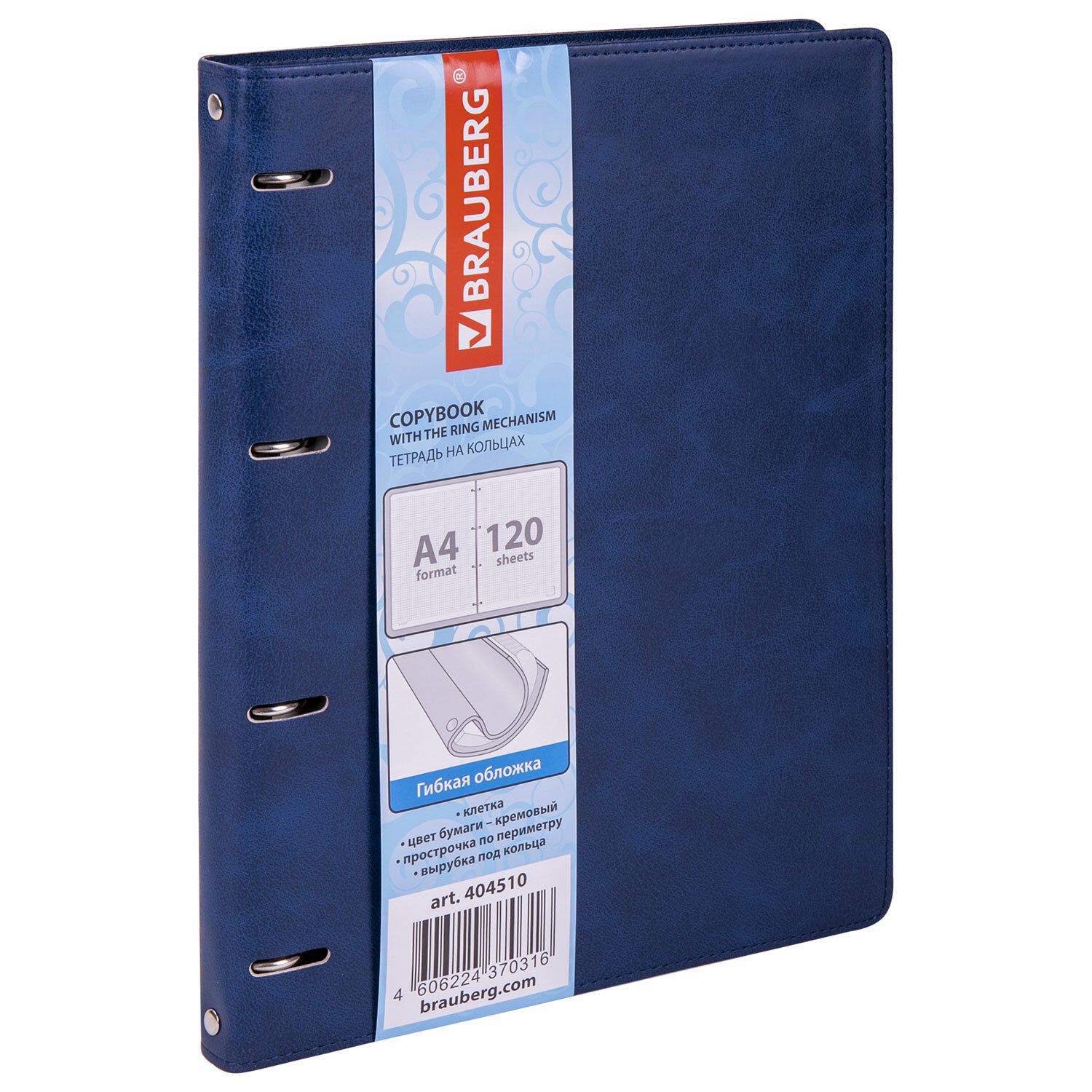 Тетрадь на кольцах БОЛЬШАЯ А4 (240х310 мм), 120 листов, под кожу, клетка, BRAUBERG "Main", синий Код товара: 404510 735,98 ₽ Купить Производитель:BRAUBERG Тетрадь на кольцах BRAUBERG "Main" – это идеальный вариант для тех, кто ценит практичные и элегантные вещи. Блок состоит из 120 листов офсетной бумаги кремового цвета плотностью 70 г/м2. Линовка – клетка с полями. Мягкая интегральная обложка с прошивкой по периметру и вырубкой под кольца выполнена из износоустойчивого материала с текстурой под гладкую кожу синего цвета. Увеличенный формат А4 предназначен для ведения большого объема записей. Кольцевой механизм позволяет легко сменить внутренний блок на новый, не покупая при этом новую тетрадь. Полезный диаметр колец – 25 мм. Одна такая тетрадь способна заменить несколько небольших тетрадей для разного рода информации.Производство: КитайКоличество листов: 120Тип обложки: экокожаФормат: А4Внутренний блок: офсетПлотность внутреннего блока: 70 г/м2Серия: MainЦвет обложки: темно-синийЦвет внутреннего блока: кремовыйТип скрепления: четырехкольцевой механизмВид линовки: клеткаНаличие полей: даПрошита по периметру: даДлина: 310 ммШирина: 240 ммТолщина: 25 ммИндивидуальная упаковка: даВес: 757 грРазмер упаковки: 3.6 × 30.7 × 24 смОбъём: 0.0021 м3Промежуточная упаковка: 15 штТранспортная упаковка: 15 штШтрих-код: 4606224370316 Сертификат-1.jpg Сертификат-2.jpg