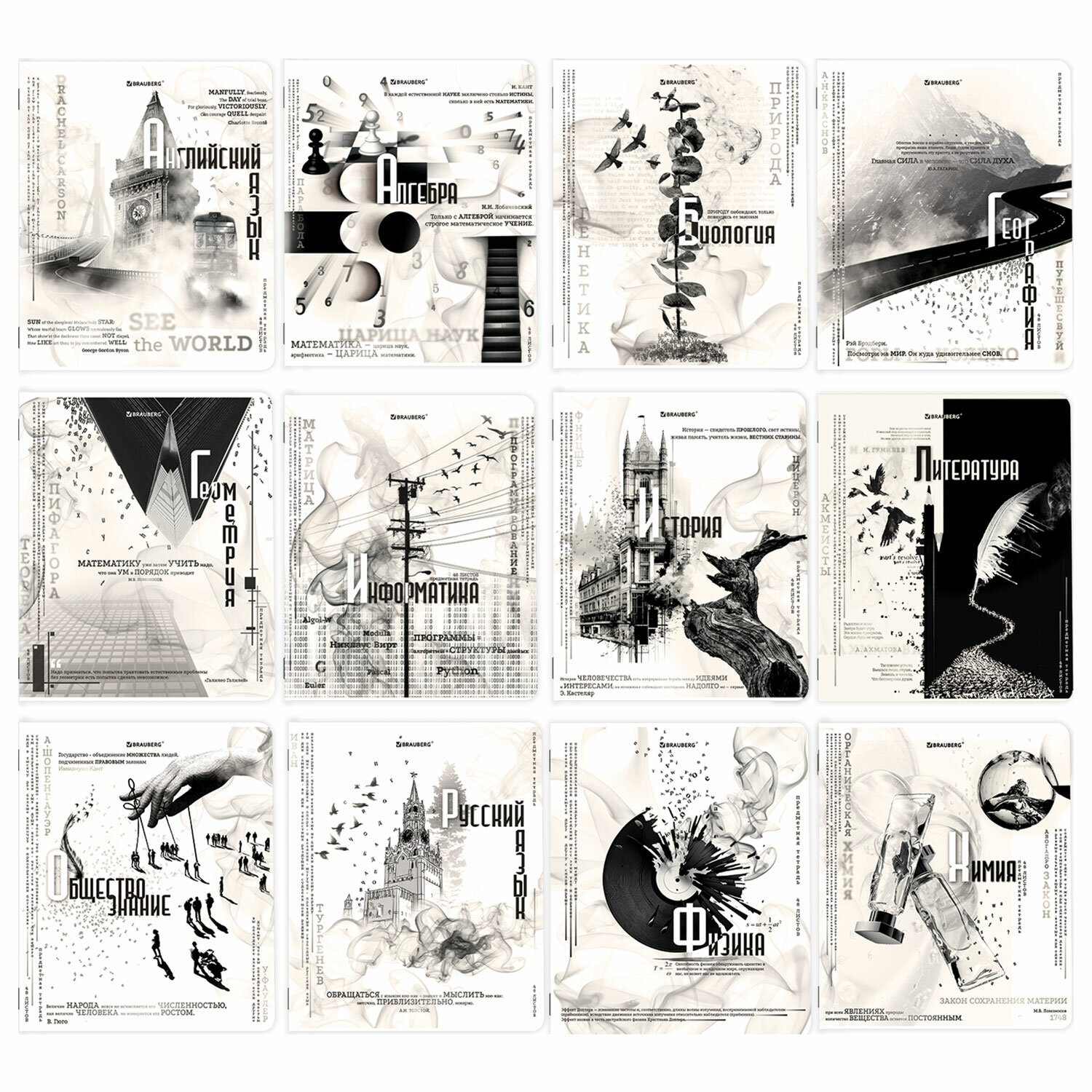 Тетради предметные, КОМПЛЕКТ 12 ПРЕДМЕТОВ, 48 л., матовая ламинация, BRAUBERG, "BLACK&WHITE" Код товара: 404835 440,64 ₽ Купить Производитель:BRAUBERG Предметные тетради BRAUBERG из серии "BLACK&WHITE" со справочным материалом предназначены для учащихся средних и старших классов. Обложка из импортного мелованного картона обеспечивает тетради долговечность. Матовое покрытие придает обложке мягкий тактильный эффект. В комплекте 12 тетрадей: Алгебра, Английский язык, Биология, География, Геометрия, Обществознание, История, Информатика, Литература (в линию), Русский язык (в линию), Физика, Химия. Тетради формата А5 содержат 48 листов, изготовленных из высококачественной офсетной бумаги плотностью 60 г/м2 и 100% белизной, с красными полями. Листы соединены скобами.Производство: РоссияПредмет: комплектСерия: комплектКоличество листов: 48Формат: А5Линовка блока: клетка/линияКрасные поля: даТип скрепления: скобаВнутренний блок: офсетПлотность внутренного блока: 60 г/м2Белизна: 100 %Обложка: мелованный картонДизайн: BLACK&WHITEПлотность обложки: 190 г/м2Тип спецэффектов на обложке: матовая ламинацияСправочный материал: даДлина: 205 ммШирина: 165 ммИндивидуальная упаковка: даВес: 1,35 кгРазмер упаковки: 5.7 × 20.4 × 16.9 смОбъём: 0.0021 м3Промежуточная упаковка: 8 штТранспортная упаковка: 8 штШтрих-код: 4606224420257 Файлы Приложение-1.pdf Приложение-2.pdf Сертификат-1.jpg Сертификат-2.jpg Сертификат-3.jpg Сертификат-4.jpg Сертификат-5.jpg Сертификат-6.jpg
