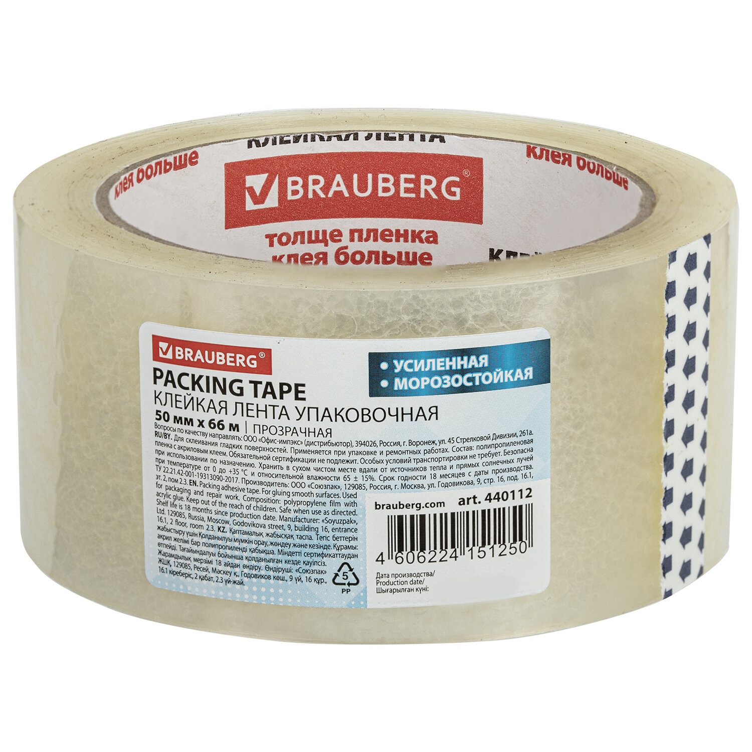 Клейкая лента упаковочная 50 мм х 66 м, прозрачная, УСИЛЕННАЯ, МОРОЗОСТОЙКАЯ, толщина 50 микрон, BRAUBERG Код товара: 440112 99,8 ₽ Купить Производитель:BRAUBERG Упаковочная клейкая лента BRAUBERG активно используется в торговле, промышленности, быту и подходит для оперативной упаковки с помощью диспенсера или вручную. Отличается высокой адгезией клея (слипанием с поверхностью) и стойкостью к разрыву. Толщина скотча 50 мкм позволяет переносить воздействие низких температур и влажности и выдерживать вес коробки 15-17 кг. Клейкой ленты шириной 50 мм и длиной намотки 66 м хватит на продолжительное время. Цвет – прозрачный.Производство: РоссияШирина: 50 ммДлина намотки: 66 мТолщина: 50 мкмКоличество в упаковке: 1 шт.Дополнительные свойства: морозостойкая, суперклейкаяДиаметр втулки: 76.2 ммТип клейкой ленты: упаковочнаяЦвет: прозрачныйУпаковка: нетСрок годности: 18 месВес: 190 грРазмер упаковки: 5.3 × 10.6 × 10.6 смОбъём: 0.0006 м3Промежуточная упаковка: 36 штТранспортная упаковка: 36 штШтрих-код: 4606224151250 Файлы Сертификат-1.jpg Сертификат-2.jpg Сертификат-3.jpg Сертификат-4.jpg Сертификат-5.jpg Сертификат-6.jpg Сертификат-7.jpg Сертификат-8.jpg Сертификат-9.jpg Сертификат-10.jpg Сертификат-11.jpg Сертификат-12.jpg Сертификат-13.jpg Сертификат-14.jpg Сертификат-15.jpg Сертификат-16.jpg Сертификат-17.jpg Сертификат-18.jpg Сертификат-19.jpg Сертификат-20.jpg Сертификат-21.jpg Сертификат-22.jpg Сертификат-23.jpg Сертификат-24.jpg Сертификат-25.jpg Сертификат-26.jpg