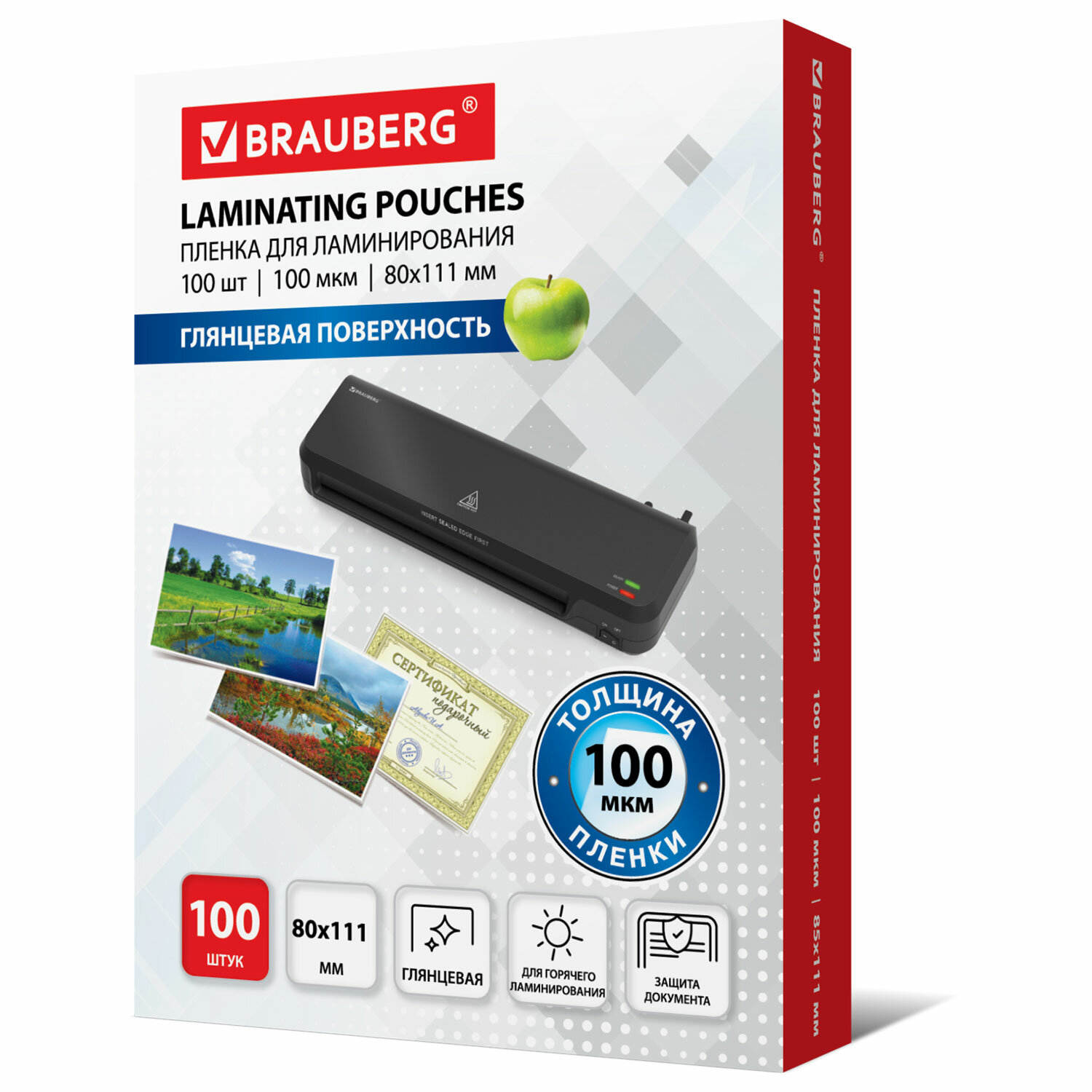 Пленки-заготовки для ламинирования МАЛОГО ФОРМАТА (80х111 мм), КОМПЛЕКТ 100 шт., 100 мкм, BRAUBERG Код товара: 530902 396,81 ₽ Купить Производитель:BRAUBERG Пленка для ламинирования BRAUBERG надежно защитит документы от влаги, пыли, воздействия УФ-лучей и других внешних факторов. Представляет собой двойной пакет, спаянный с одной стороны (содержание полиэстера > 50%). Документ вкладывается между слоями пленки и в дальнейшем подвергается термообработке в ламинаторе. Суммарная толщина пленки-заготовки - 200 (100х2) мкм, что позволяет защитить документы и увеличить жесткость, сохраняя яркость изображения. Пленка для ламинирования BRAUBERG малого формата (80х111 мм) имеет уникальный состав: полиэтилентерефталат (PET), этиленвинилацетат (EVA), полиэтилен (LDPE). Промежуточный слой полиэтилена (LDPE) выступает как связующий элемент между слоями PET и EVA, служит дополнительной защитой от вероятного вытекания клея из-под пленки при ламинировании. Полиэтилен (PE) придает пакетам прочность эластичность и износостойкость. Глянцевое покрытие пленки способствует сохранению и максимальной передаче цвета ламинируемого изображения. Поставляется в картонной упаковке по 100 штук, которых при нечастом использовании хватает на продолжительное время.Производство: КитайФормат: нестандартныйТолщина пленки: 100 мкмТип: пакетДлина: 80 ммШирина: 111 ммТип плёнки: глянцеваяВ комплекте: 100 шт.Вес: 221 грРазмер упаковки: 2.3 × 11.6 × 8.6 смОбъём: 0.0003 м3Промежуточная упаковка: 100 штТранспортная упаковка: 100 штШтрих-код: 4606224105970 Файлы Сертификат-1.jpg Сертификат-2.jpg Сертификат-3.jpg Сертификат-4.jpg Сертификат-5.jpg Сертификат-6.jpg Сертификат-7.jpg Сертификат-8.jpg Сертификат-9.jpg Сертификат-10.jpg Сертификат-11.jpg Сертификат-12.jpg Сертификат-13.jpg Сертификат-14.jpg Сертификат-15.jpg Сертификат-16.jpg Сертификат-17.jpg Сертификат-18.jpg Сертификат-19.jpg Сертификат-20.jpg Сертификат-21.jpg Сертификат-22.jpg Сертификат-23.jpg Сертификат-24.jpg Сертификат-25.jpg Сертификат-26.jpg
