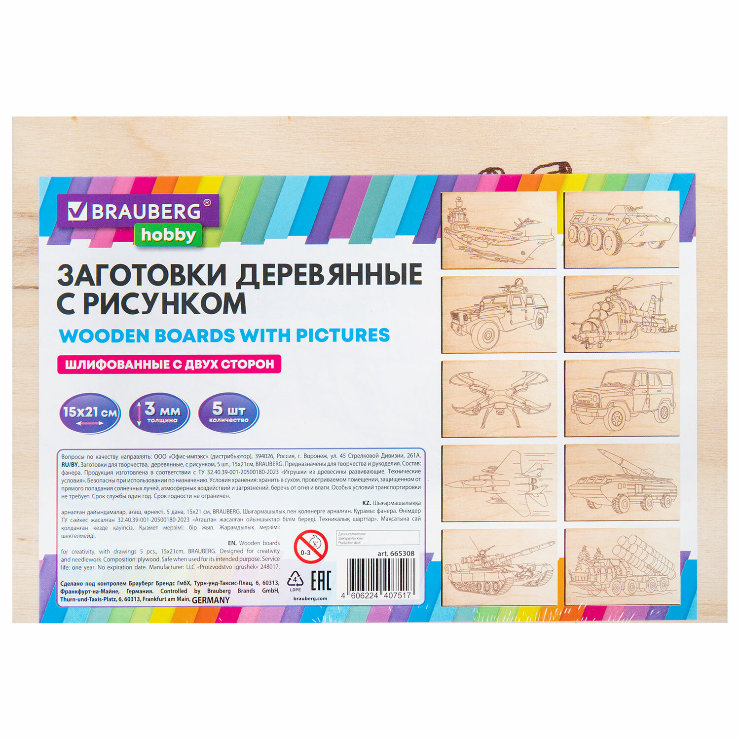 Заготовки деревянные для выжигания "Военная техника", 5 шт., 10 рисунков, 15х21 см, BRAUBERG HOBBY Код товара: 665308 246,68 ₽ Купить Производитель:BRAUBERG HOBBY Набор досок для выжигания с рисунком BRAUBERG HOBBY подходит для выполнения работ по выжиганию или росписи красками. На каждую доску с двух сторон нанесен рисунок. Разнообразие дизайнов удовлетворит самого взыскательного творца. Товар предназначен для взрослых, увлекающихся творчеством, и детей старше 3 лет. В набор входят 5 досок толщиной 3 мм и размером А5. Сортность фанеры - 1/1 - отличается светлым тоном заготовок и почти полным отсутствием дефектов на поверхности. На каждую доску с двух сторон нанесены контурные детализированные изображения различных видов военного транспорта. Изделия упакованы в термоусадочную пленку для надежного предохранения от влаги и деформирования. Деревянное полотно достаточно плотное, при резке не ломается, что позволяет с легкостью моделировать изделия любой формы. Поверхность тщательно отшлифована и подходит не только для выжигания по дереву, но и для росписи акриловыми красками, гуашью, фломастерами. Для росписи рекомендуется использовать акриловые краски. Деревянная заготовка относится к товарам средней ценовой категории. Срок годности не ограничен. Деревянная заготовка BRAUBERG HOBBY заинтересует детей и взрослых, увлекающихся творчеством. Работа с таким набором тренирует мелкую моторику, развивает усидчивость, внимательность и аккуратность. Получившиеся картинки станут оригинальным украшением или подарком. От них веет безмятежностью, умиротворением и теплом, а сам процесс работы всегда приносит настоящее удовольствие.Производство: РоссияТип товара: Доски деревянные для выжигания с рисункомКомплектация: доски для выжиганияФормат: Военная техникаКоличество досок с рисунком: 5 шт.Количество чистых досок: 0 шт.Количество насадок к выжигателю: 0 шт.Материал заготовок: фанераВозрастная группа от: 3Длина: 21 смШирина: 15 смТолщина: 3 ммУпаковка: термоусадочная пленкаВес: 339 грРазмер упаковки: 1.5 × 20.9 × 15.1 смОбъём: 0.0006 м3Промежуточная упаковка: 48 штТранспортная упаковка: 48 штШтрих-код: 4606224407517 Сертификат-1.jpg Сертификат-2.jpg Сертификат-3.jpg