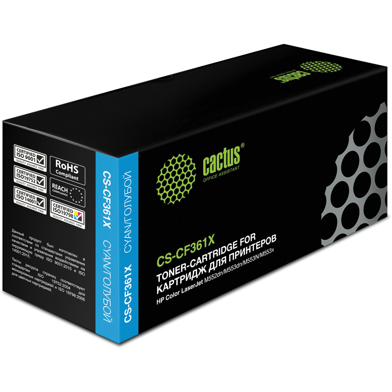 Картридж лазерный CACTUS (CS-CF361X) для HP LaserJet Pro M552dn/M553dn/M553n, голубой, ресурс 9500 стр. Код товара: 362519 2 148,79 ₽ Купить Производитель:CACTUS Картриджи CACTUS — это оптимальное соотношение цены-качества, надежность, сервис и гарантия компании. Отпечатки, сделанные с помощью картриджей CACTUS, обеспечивают качественную, надежную печать и отличную цветопередачу. Совместимый картридж для цветных лазерных принтеров и МФУ: HP Color LaserJet M552dn / M553dn / M553n / M553x / M577dn / M577f / M577c. Компания CACTUS гарантирует стабильную работу всей своей продукции в течение 12 месяцев с момента приобретения при соблюдении условий эксплуатации. Изображения товара, включая цвет, могут отличаться от реального внешнего вида. Упаковка товара также может быть изменена производителем без предварительного уведомления.Производство: КитайЦвет: голубойСерия: CS-CF36хТип печати: для лазерной печатиТип расходного материала: совместимыйРесурс при 5% заполнении листа А4: 9500 страницКоличество в упаковке: 1 шт.Вес: 1,04 кгРазмер упаковки: 16.2 × 35.2 × 12.3 смОбъём: 0.007 м3Промежуточная упаковка: 1 штТранспортная упаковка: 1 шт Файлы Сертификат-1.jpg Сертификат-2.jpg Сертификат-3.jpg Сертификат-4.jpg Сертификат-5.jpg Сертификат-6.jpg Сертификат-7.jpg Сертификат-8.jpg Сертификат-9.jpg Сертификат-10.jpg Сертификат-11.jpg Сертификат-12.jpg Сертификат-13.jpg Сертификат-14.jpg Сертификат-15.jpg Сертификат-16.jpg Сертификат-17.jpg Сертификат-18.jpg Сертификат-19.jpg Сертификат-20.jpg Сертификат-21.jpg Сертификат-22.jpg Сертификат-23.jpg Сертификат-24.jpg Сертификат-25.jpg Сертификат-26.jpg