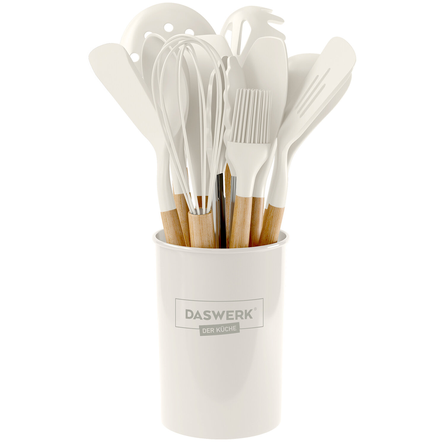 Набор силиконовых кухонных принадлежностей с деревянными ручками 12 в 1, молочный, DASWERK (ДАСВЕРК) Код товара: 608193 1 126,95 ₽ Купить Производитель:DASWERK Стильный и функциональный набор силиконовых кухонных принадлежностей DASWERK с подставкой. Станет незаменимым помощником для всех, кто умеет и любит готовить. В набор входят 11 самых необходимых аксессуаров для кухни и подставка: • удобная лопатка для жарки (длина – 32 см), • шпатель (длина – 32 см), • венчик (длина – 25 см), • щипцы (длина – 23 см), • плоская ложка для выпечки (длина – 32 см), • лопатка с отверстиями для слива масла (длина – 32 см), • половник (длина – 32 см), • ложка для салата (длина – 32 см), • кисточка для масла (длина – 26,8 см), • ложка для спагетти (длина – 32 см), • шумовка (длина – 33,5 см), • подставка из пластика. Рабочая часть кухонных принадлежностей изготовлена из пищевого силикона, а ручки – из дерева (бук). Силикон с антипригарным покрытием выдерживает высокие температурные нагрузки, не впитывает запахи, легко моется и полностью безопасен для здоровья. Меры предосторожности: чтобы не повредить лаковое покрытие, кухонные принадлежности не рекомендуется мыть в посудомоечной машине. Для устранения заводского запаха перед первым использованием набор необходимо хорошо промыть с моющим средством. Кисточка для масла имеет съемную ручку. С набором кухонных принадлежностей DASWERK готовить легко и приятно!Производство: КитайКоличество в комплекте предметов: 12 шт.Особенности: нескользящая рукояткаСостав набора: лопатка для жарки, шпатель, венчик, щипцы, плоская ложка для выпечки, лопатка с отверстиями для слива масла, половник, ложка для салата, кисточка для масла, ложка для спагетти и шумовкаМатериал: силиконМатериал ручки: букЦвет: белый матовыйСерия: DER KUCHEНазначение: для приготовления пищиВес: 1,2 кгРазмер упаковки: 12.8 × 33.7 × 12.8 смОбъём: 0.0065 м3Промежуточная упаковка: 16 штТранспортная упаковка: 16 штШтрих-код: 4606224371986 Сертификат-1.jpg Сертификат-2.jpg Сертификат-3.jpg